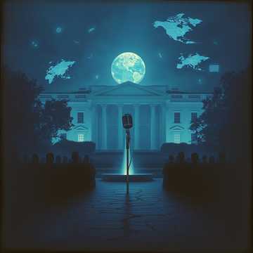 Dark political orchestral-choral musical number, 72 BPM, slow dramatic pulse, Heavy marching drums, low cinematic strings, tense brass clusters, distant piano and deep synth drones, Male lead vocal in anxious spoken-singing style, answered by powerful mixed choir in solemn unison chorus, Atmosphere of global crisis, White House tension, loss of control and rising fear, Gradual crescendo to massive choral peak, then sudden silence and unresolved minor chord fading into холодный эмбиент неопределённости