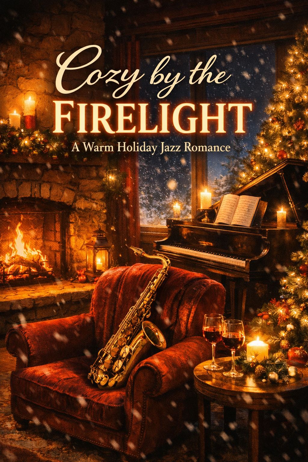 Cozy holiday jazz with warm piano chords, brushed drums, upright bass, soft sax accents, vintage lounge vibes, gentle swing, and intimate winter-night warmth