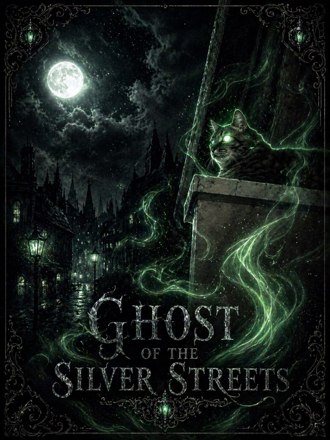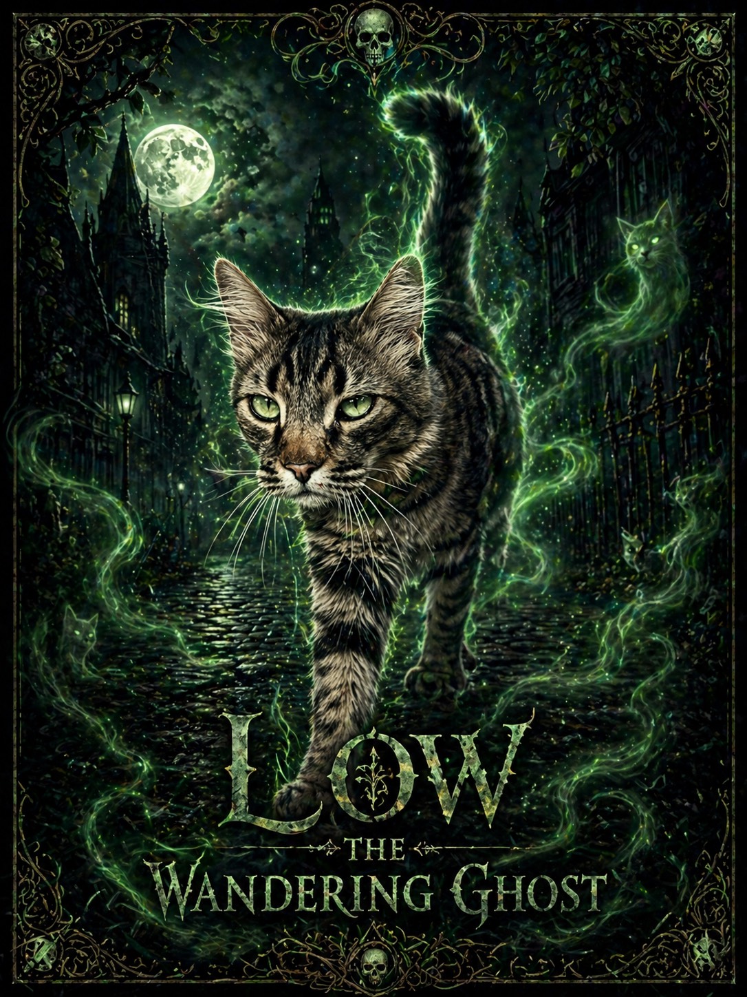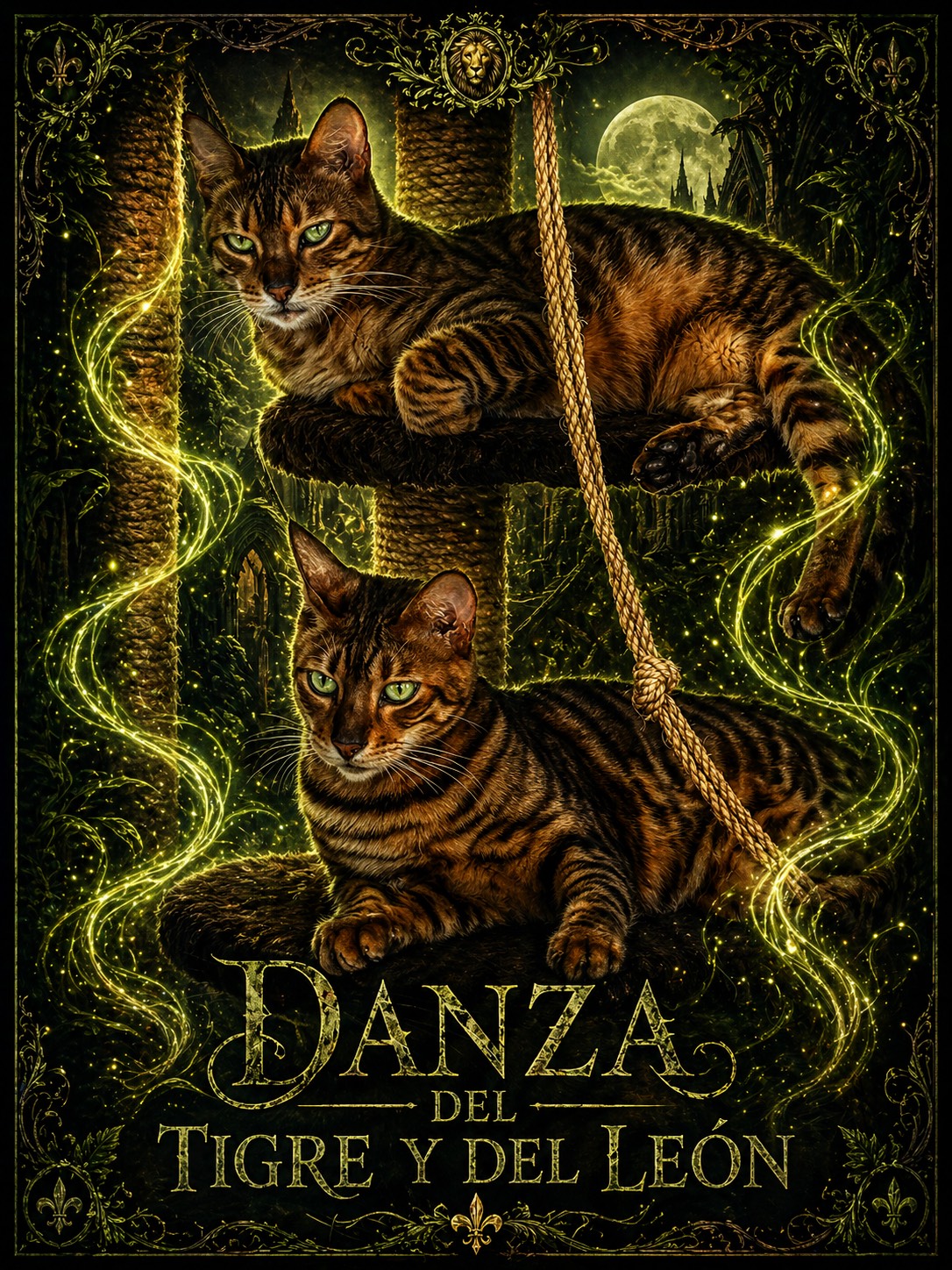 Dark gothic rock at 105–110 BPM with bright but ominous overdriven electric guitar riffs, melodic high-gain lead lines, and sustained feedback-laced chords, Prominent electric bass driving a brooding low-end, matched with punchy rock drums that push strong, forward-leaning kick patterns and dramatic tom accents, Extended virtuoso guitar solo section with soaring bends and minor-scale runs, drenched in reverb and delay, Female lead vocal, expressive and intimate in the verses, opening into powerful, theatrical choruses with layered dark harmonies and distant choral pads that deepen the gothic atmosphere, Overall mood is intense, shadowy, and majestic, blending feline grace with cathedral-like rock drama