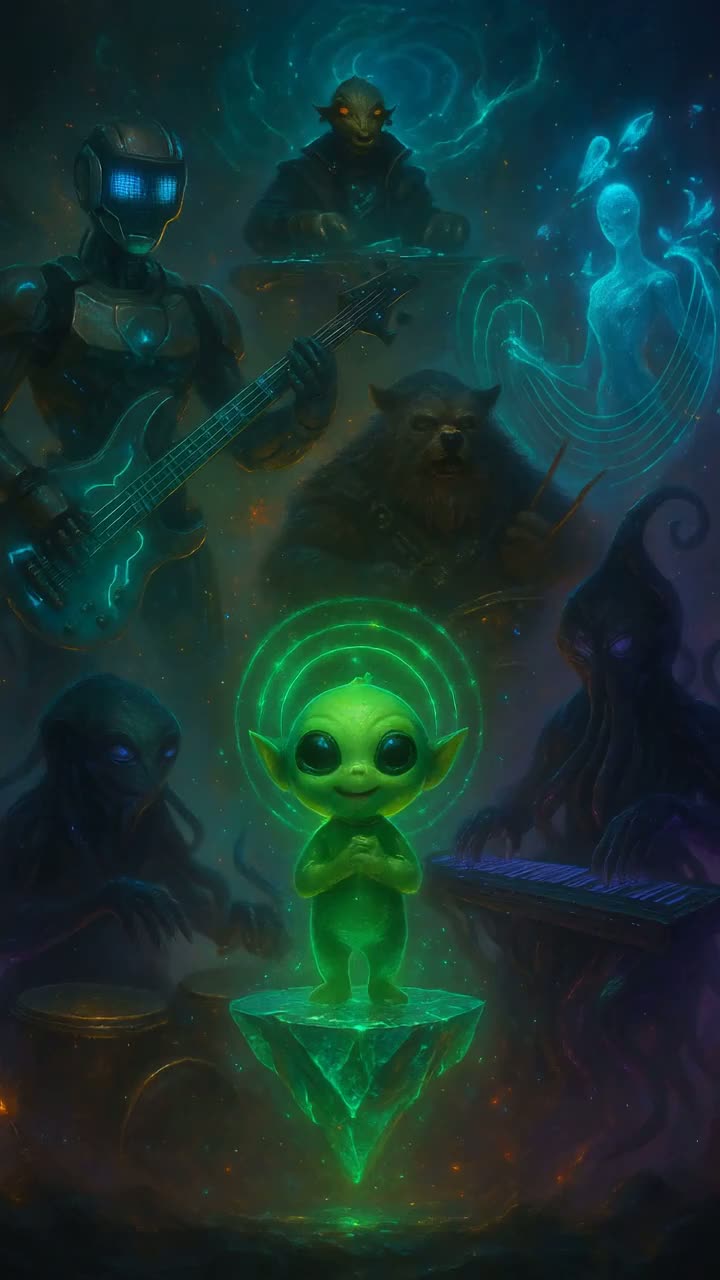 The Cosmic Greenlight Collective blends whimsical alien pop with jubilant, energetic space-funk and shimmering extraterrestrial soul, Lyxo’s cute, glowing alien voice sounds melodic, otherworldly, and playful — filled with tiny chirps, floating harmonics, and gentle cosmic innocence, The band weaves genres like 8-bit arcade chiptune, glitch-hop pulses, EDM bursts, ska rhythms, symphonic swells, R&B warmth, trap swagger, rap interludes, singer-songwriter intimacy, gospel uplift, opera soprano choir light, medieval motifs, heroic brass, villainous low tones, and victorious fanfare, R0-B4SS delivers deep robotic basslines, T’Naru creates liquid-light synth tapestries, Druum-Ber drives meteor-force drums, Zilara shapes celestial harp threads, and K’RRK spins dimensional FX, Their sound is anthemic, catchy, cinematic, emotional, and joyfully alien — a cosmic celebration of unity, rhythm, and interstellar harmony, Folk, Jazz, EDM, Rap, Metal, Rock, Funk, Instrumental, Pop, Country