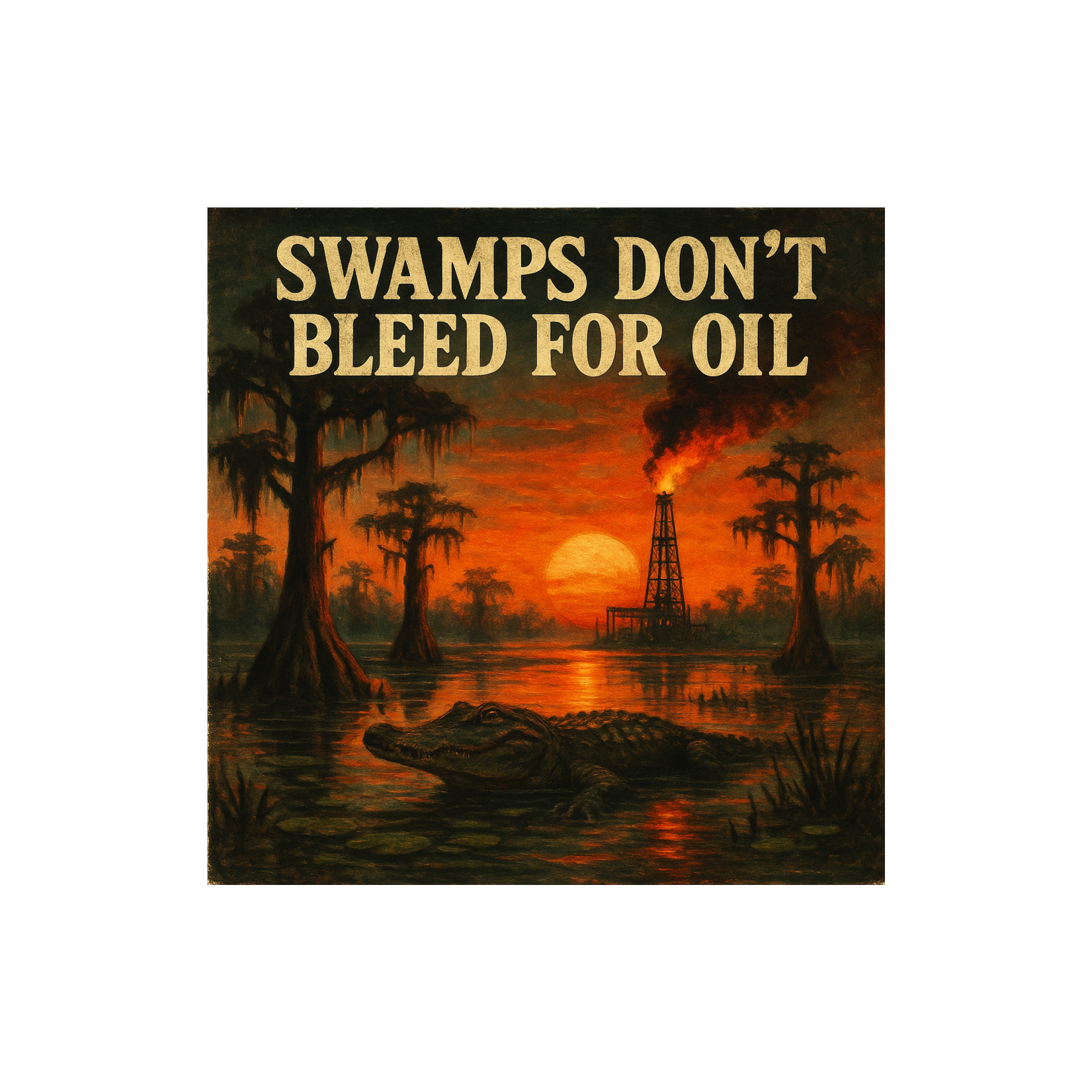 Drums: Swamp stomp kick (deep & thuddy), snare with gated reverb (marching/war-drum feel), tom-heavy fills, Bass: Dirty, overdriven bass with fuzz — syncs with kick for a marching pulse, Guitar 1 (Rhythm): Low swamp-blues riff, open E power chords, slight tremolo, swampy reverb, Guitar 2 (Lead): Slide guitar drenched in delay; occasional “screaming bends” mimicking sirens