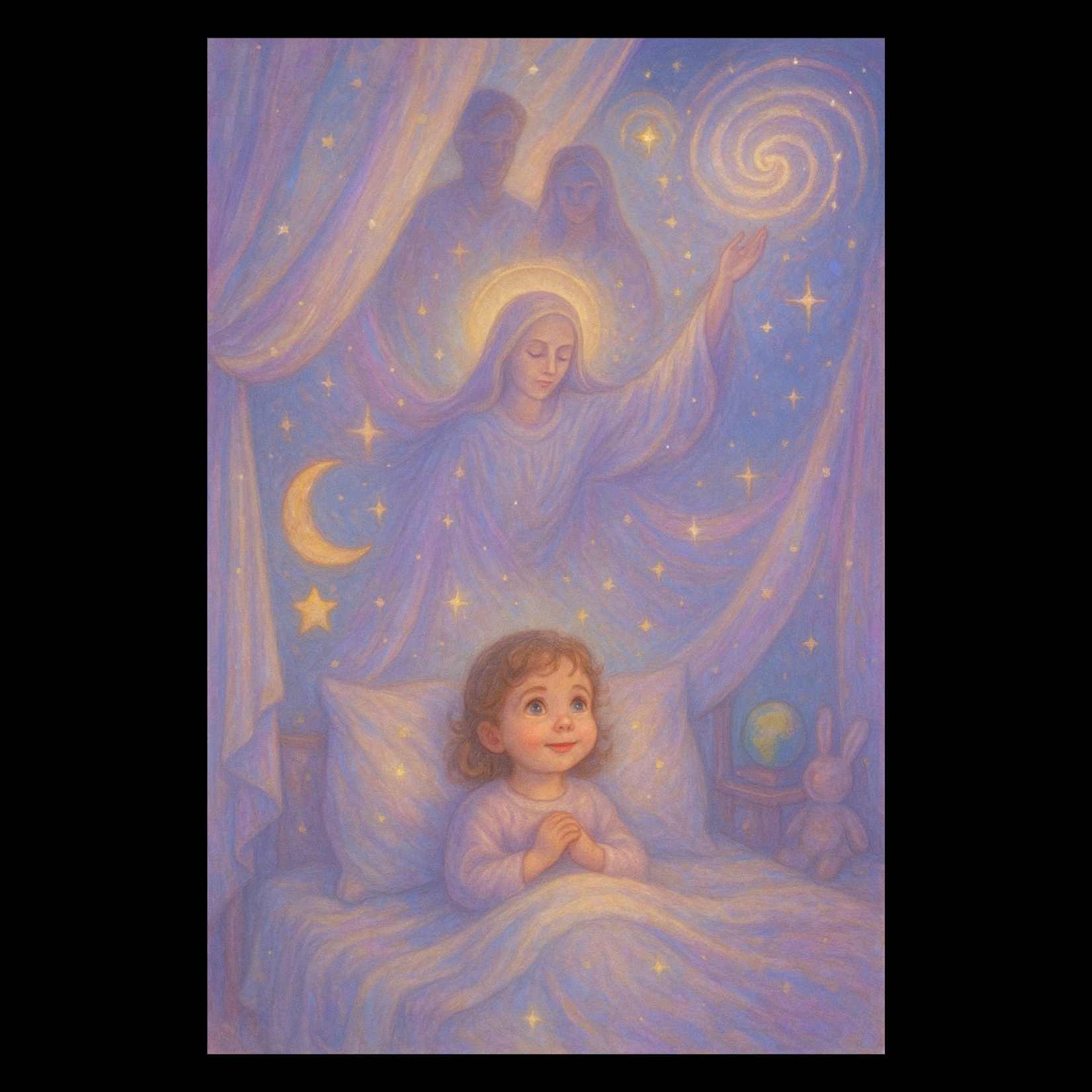 The lullaby opens with slow, glistening Stellar harp arpeggios, crafting a celestial foundation, An ethereal AI angelic chorus gently harmonizes in the background, their textures enveloping the melody, Sparse, soft pads and subtle atmospheric sounds sustain a soothing, dreamy atmosphere throughout