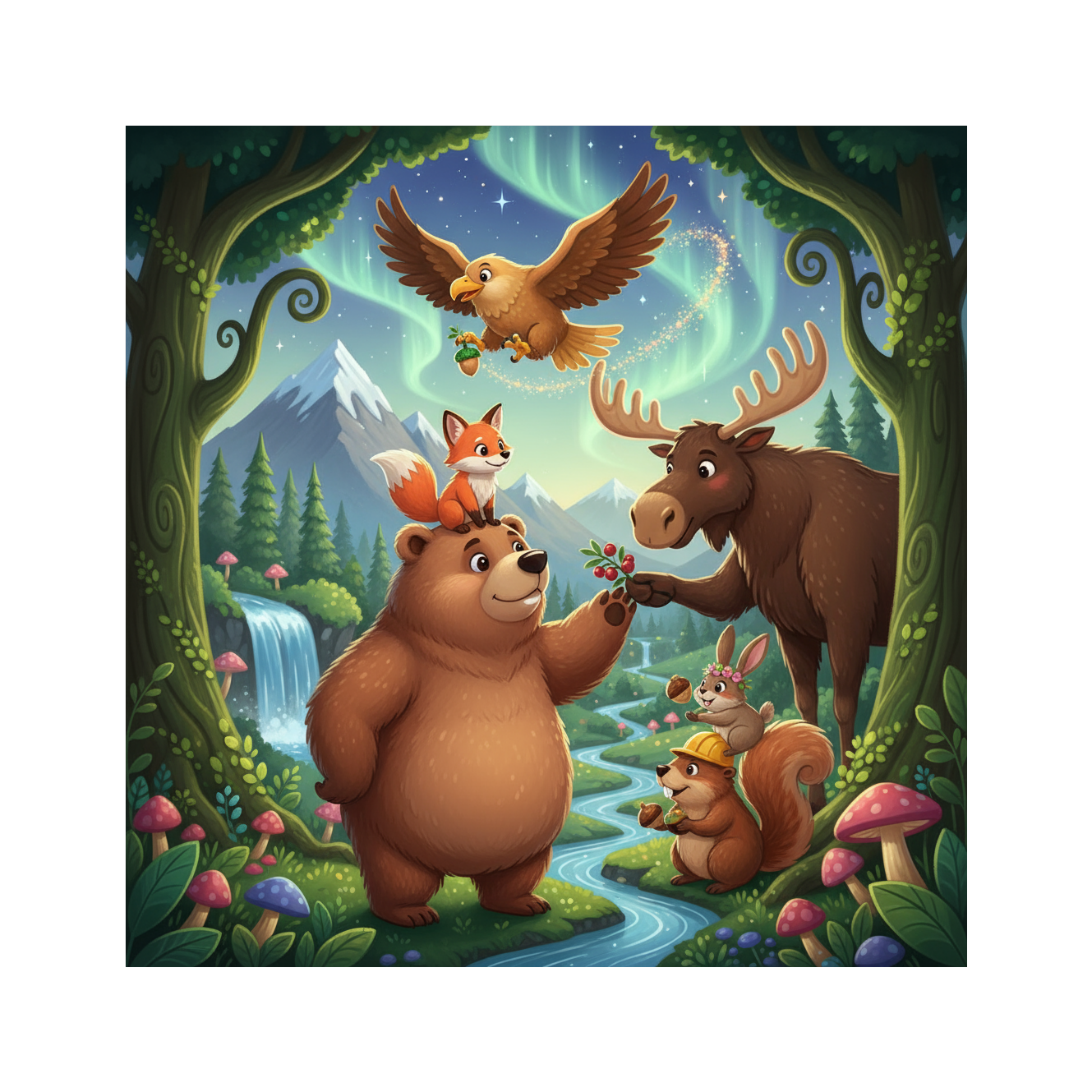 A folk-rock track starting with warm acoustic guitar strumming, introducing breezy nature-inspired flute lines, Gentle violin textures add depth while light percussion and woodblock accents set a steady mid-tempo walking groove, Harmonica fills and storytelling vocals evoke a cozy campfire atmosphere, ‑no scary atmosphere, ‑no harsh electric distortion, ‑no loud aggressive drums, ‑no screaming, ‑no minor key darkness, ‑no industrial sounds, ‑no techno beats, ‑no sad emotional vocals