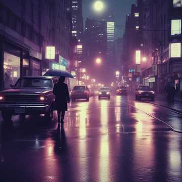 dark, noir-inspired, futuristic dystopian melancholic feel, Incorporate the sound of rain - jazz female singer choir