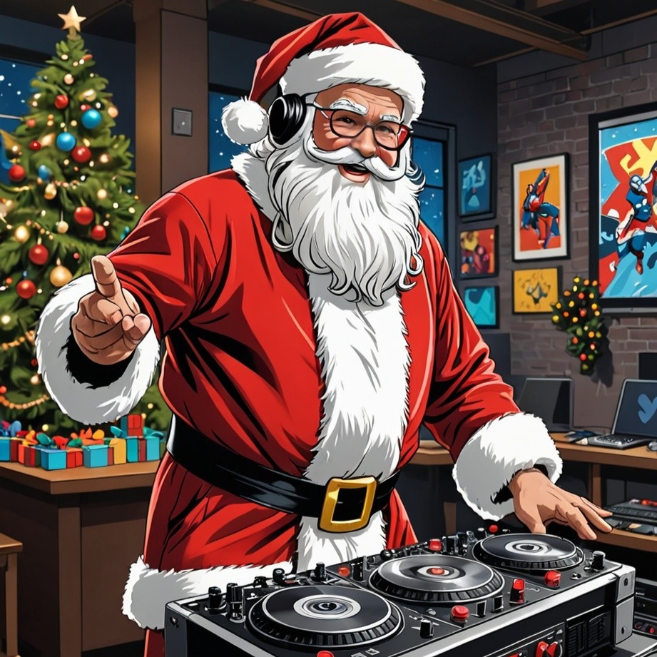 jolly santa voice, melodic dubstep blend with Christmas sounds, harp Gabber-step, goa