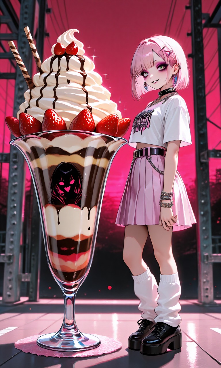 Electro Swing, Shibuya-kei, Cute Jazz that gradually transforms into Death Metal, 134 BPM, bright sweet female vocal, playful and happy first half, dark undertones emerging in second verse, distorted sub bass creeping in, subtle blast beat textures, dramatic breakdown with slow tension build, sudden extreme death metal guitar solo with blast beats and 8-string riffs, harmonic minor shredding, then returning to pure cute swing sound for final chorus, glossy colorful surface with hidden abyss, cinematic dynamic contrast