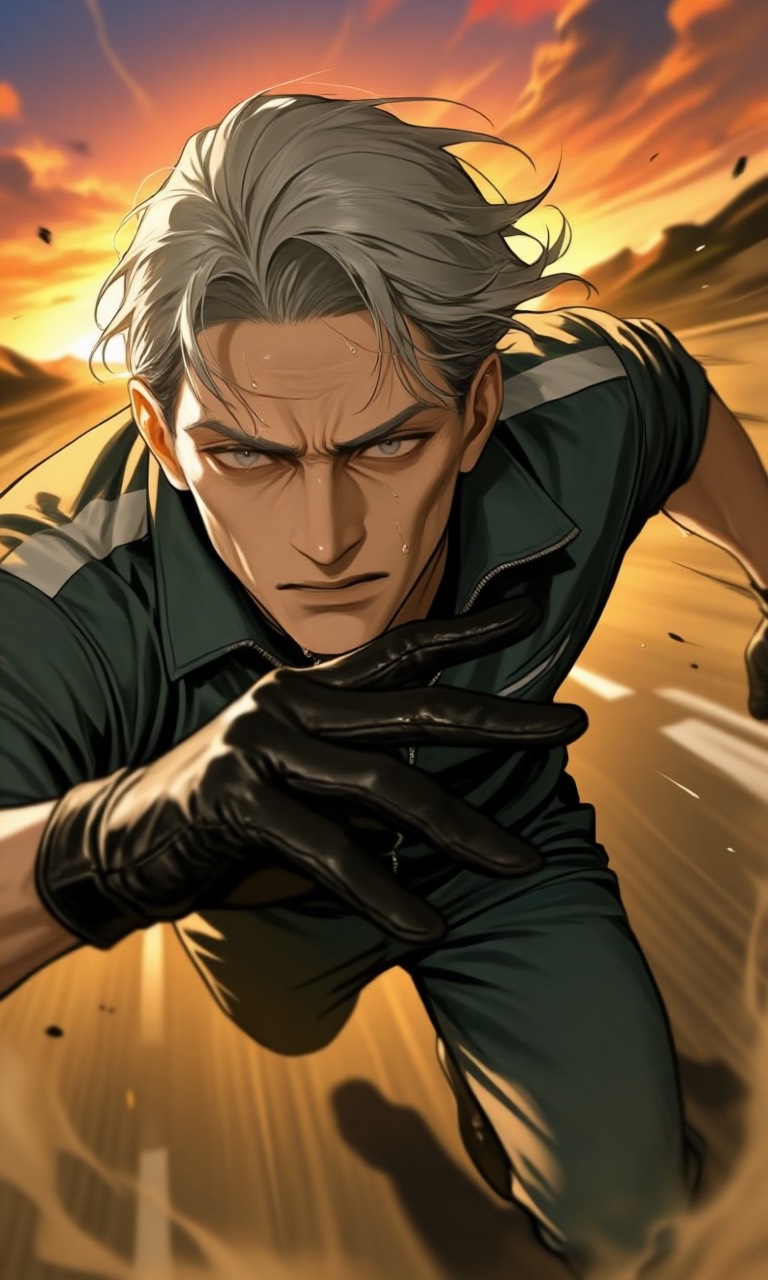 Avant-Garde Electro Swing × Melodic Speed Metal, Very Fast BPM (190), Aggressive Double Kick Drums, Swing Jazz Breaks, Distorted Upright Bass, Emotional Harmonized Speed Metal Guitar Solos, Dramatic Modulations, Epic And Melancholic Atmosphere, Elderly Male Vocal, Raspy, Deep, Emotional, Powerful, Sense Of Running At Sunset, Life, Time, Persistence, Passion, Explosive, Cinematic, Dramatic