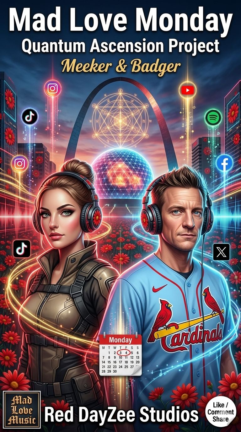 John DayZee – “Mad Love Monday at ShieldSong (314 Forever)”: Slim Dusty-style waltz soaked in pure St, Louis blood, John & Dolo stroll their aerospace fortress-mansion loaded with 314 icons—Gateway Arch fountain, Ted Drewes freezer, Imo’s Provel, Crown Candy malt rocket fuel, Muny ghosts, Cahokia mound, Soulard masks, Delmar Divide runway, Eads Bridge memories, Every verse drips toasted-ravioli heart, Cardinals sunset, Yellowbird donuts in ketchup mud, Mad Love Monday is the fuel; family, flight & the Lou are the mission, Pedal steel weeps like the Mississippi, Kids sing the final chorus, Red DayZee Studios forever, #MadLoveMonday #314Forever