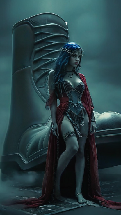Doom metal and trap fusion, Down-tuned, heavy and fat guitars with percussive, aggressive riffs, Deep bass/sub-bass with glide, portamento, elastic and fluid, Hybrid drums mixing trap hi-hats, punchy 808 kicks, sharp snares, with intense double-kick bursts and crashing cymbals, Female vocals: versatile flow-driven rap, smooth and melodic clean singing, and raw screams for impact