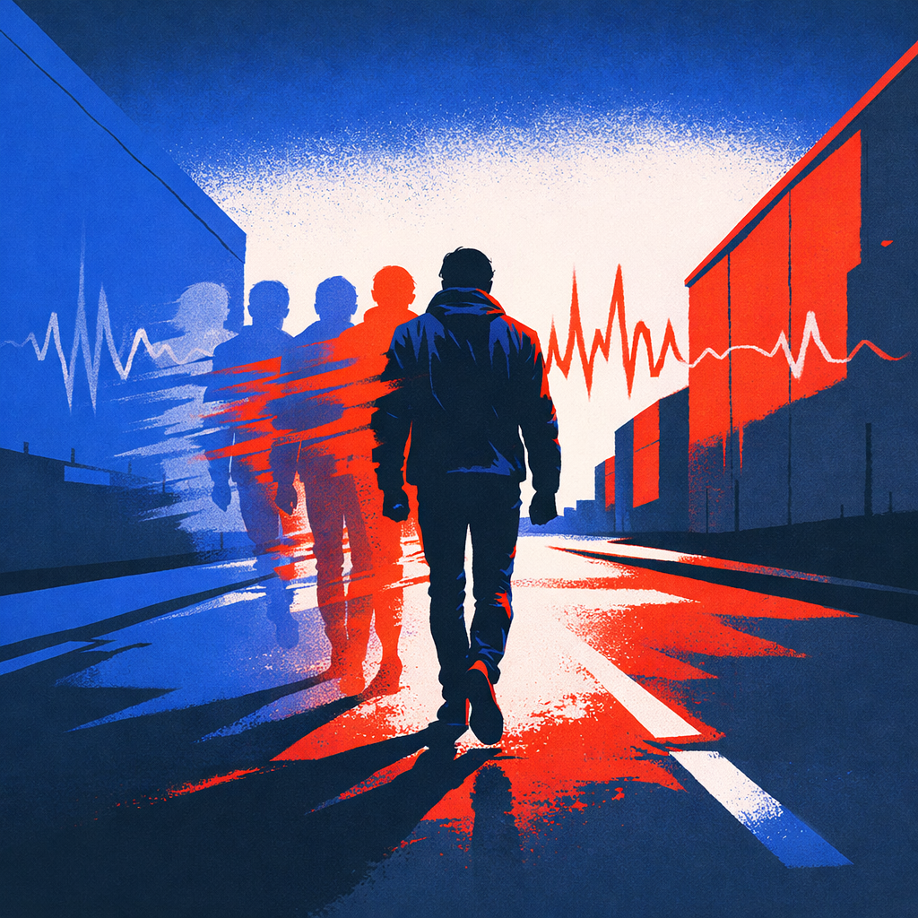A fast, angular post-punk and electro-grunge hybrid driven by mechanical rhythm and restless energy, Fuzzy bass and metallic drums cut through neon-lit synths; guitars switch from clean jangle to saturated bursts of distortion, Vocals are femaleโcool, half-spoken, half-sung in a tone between Kim Gordonโs detachment and Karen Oโs explosive edge, The atmosphere feels urban, modern, and wired: streets alive with motion, lights flickering on glass, digital noise humming beneath the surface, Glitch fragments and bit-crushed fills punctuate each section; feedback tails and stereo sweeps stretch the mix into wide, cinematic space, The track captures the pulse of a city that never sleeps yet feels strangely hollowโa grey world where connection and isolation coexist