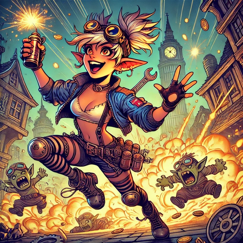 female British/cute vocals, fast n fiery rap, hard hits, bounce, trumpet, violin, tricky-tinker-top-hip-hop trap, whimsy, neon smog, start n stop, EDM(Electrum Dance Melody), hectic, goblin-gold, ‑male vocals, ‑separate vocals