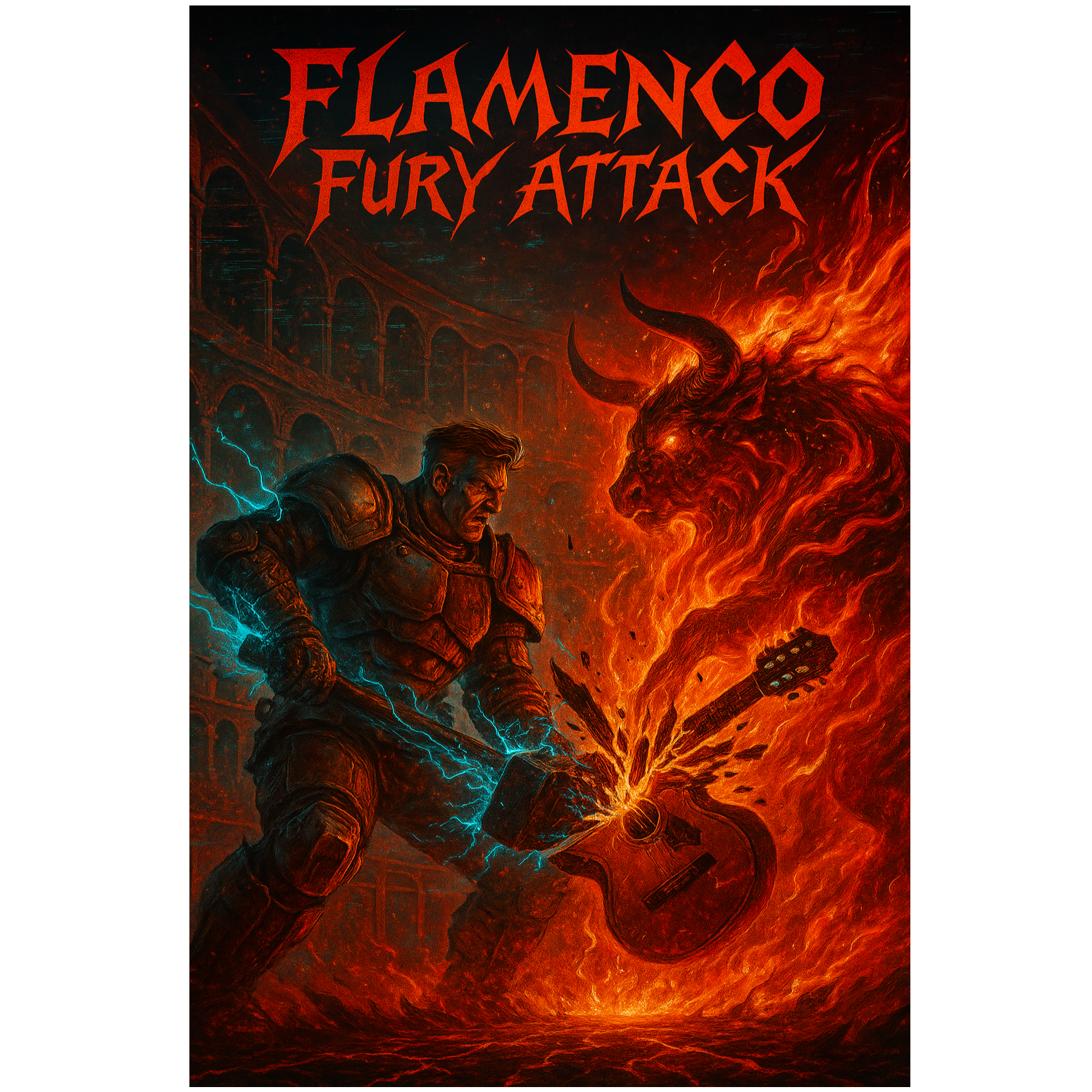 Nu-metal fused with industrial and flamenco, Drop-tuned guitars with heavy riffs dueling flamenco acoustic guitar strums and tremolos, Cajón and palmas layered with industrial stomps and glitch synths, BPM ~120, Vocals: Aggressive male shouts with 'Olé' chants, Emotion: Passion, chaos, flamenco fury, FX: Arena reverb, Spanish claps, distorted industrial crashes