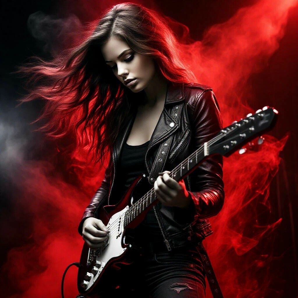 Doom metal and trap fusion, Down-tuned, heavy and fat guitars with percussive, violent riffs, Deep bass/sub-bass with glide, portamento, elastic and fluid, Hybrid drums mixing trap hi-hats, punchy 808 kicks, sharp snares, with intense triolets-kick bursts and crashing cymbals, Female vocals: versatile flow-driven rap, smooth and melodic clean singing, and raw screams for impact