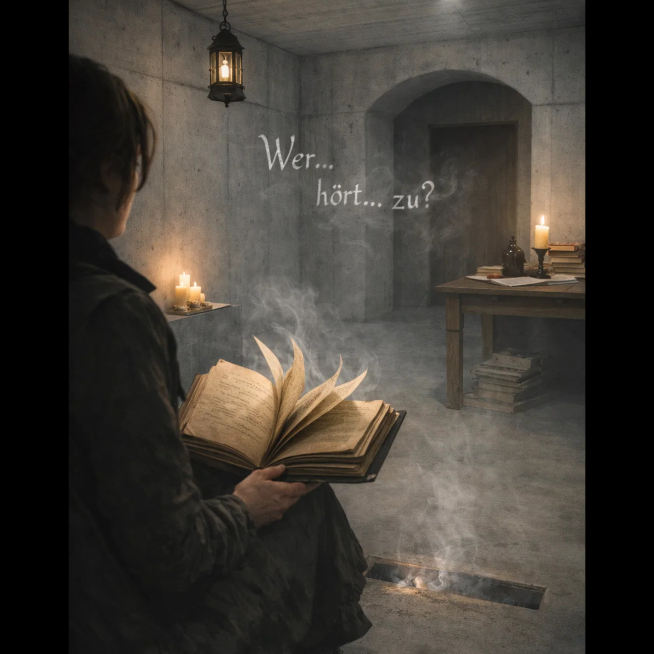 Dark experimental spoken word, male sub-baritone voice with soft vocal fry, mixed with ethereal female backing vocals, slow tempo, atmospheric ambient with subtle trip-hop rhythm, deep warm bass, textured sound design, spatial reverb, hypnotic and slightly playful tone, storytelling focus, dynamic transitions between spoken and melodic parts, cinematic, mysterious, layered, organic flow