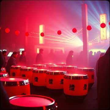 Style: Minimalistic fusion of Japanese traditional festival taiko and hypnotic techno/EDM, Use repetitive, trance-inducing taiko rhythms (e, g, don-don-don-doko) like those played from a yagura tower during bon odori, Keep the arrangement stripped-down and loop-focused—kick, taiko, and subtle bass synths driving the groove, Tempo: 118–122 BPM, Include sparse FX like wind chimes, woodblocks, or metallic gongs for texture, Avoid melodies—focus on rhythm, pulse, and space, Add stereo-panned claps and percussive chants ("ha!" "yo!" "don!") to create a sense of ritual, Build and break gradually like a dance circle, always returning to the central beat, Instrumental only, Mesmerizing and physical