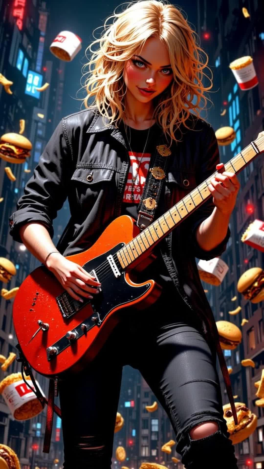 melodic grunge trap, with sliding guitars, mcrib 808's, big mac hi-hats, raspy grunge female vocal dipped in barbeque sauce, Mcshake background female singers, cool ad-libs, echoes, reverb, multilayered vocals