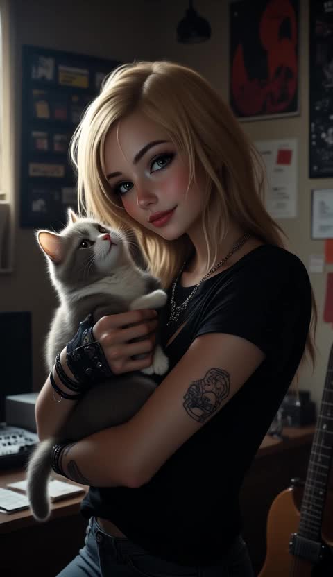 grunge, song starts quiet and slow then the tempo ramps up by midway in the song with rising boiling emotion and anger, but meows are sweet beause she loves her cat, raspy female vocalist, background female singers
