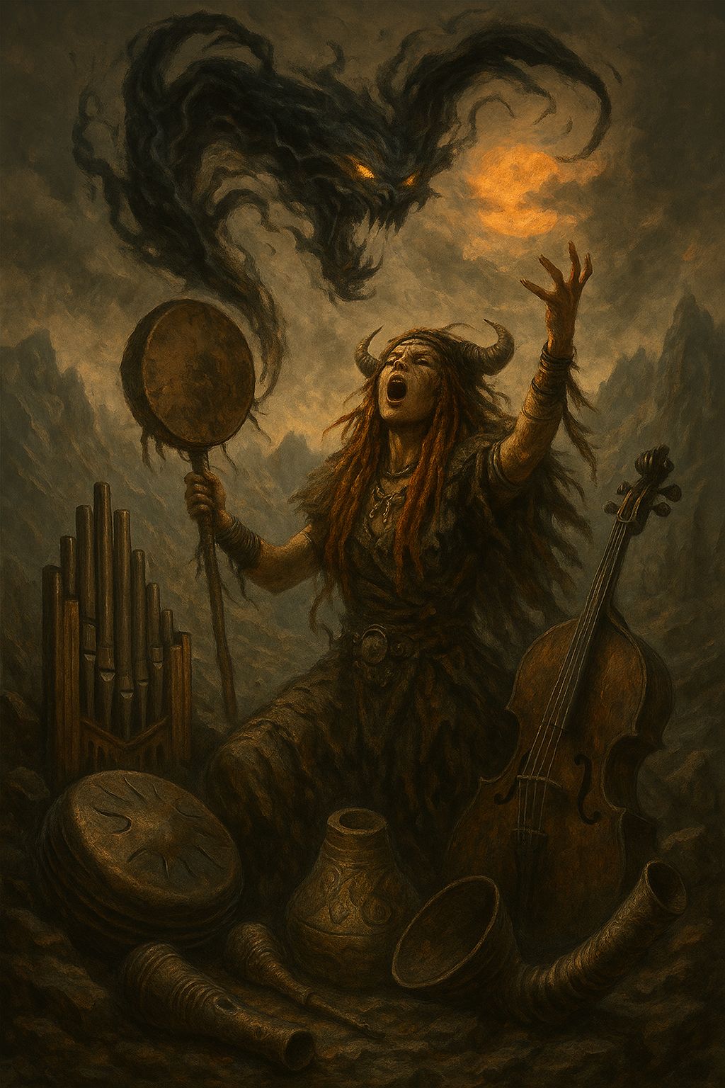 Bro-Filthstep Fusion // Celtic-Hindu Raga // Epictronica // Ritual Percussion, Subharmonic Glitch Texture, Bagpipe and Tanpura Lead, Mantra Vocals; Build a genre-blending sonic experience rooted in modal Celtic bagpipe drones and Indian raga scale phrasing layered with aggressive bro-filthstep growl collapses and ritual percussion patterns, Lead instrumentation should revolve around bagpipes and tanpura with melodic call/response over glitch-splintered wobble-wonk sections, Heavy bro-filthstep growls drive the drop sections and create pressure-release tension after modal buildup, Adlib vocal mantras should repeat like hooks ~ catchy, fierce, and primitive ~ and float over the top of everything clearly audible, Mix should prioritize textural contrast and spatial bleed between organic drones and synthetic destruction