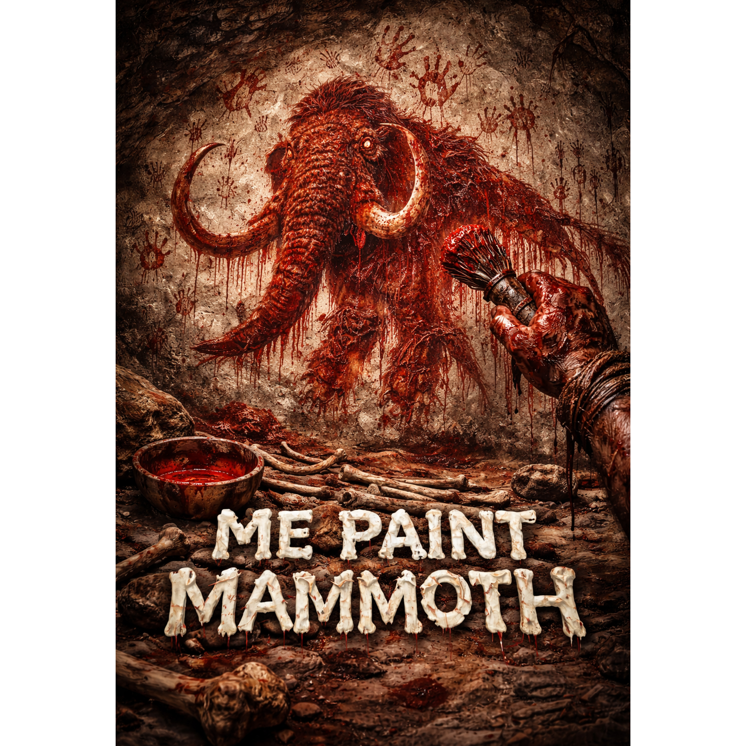 Ultra primitive caveman slam death metal, caveman riffs, one-string chug worship, drop E / drop D#, ugly raw mix, no clean vocals, deep gutturals + caveman shouts, occasional pig squeal, relentless blasts into stupid halftime slams, huge sub drops, bone percussion, cave ambience (drips, stone scrapes), short violent 2:30–3:00, minimal melody, maximum impact