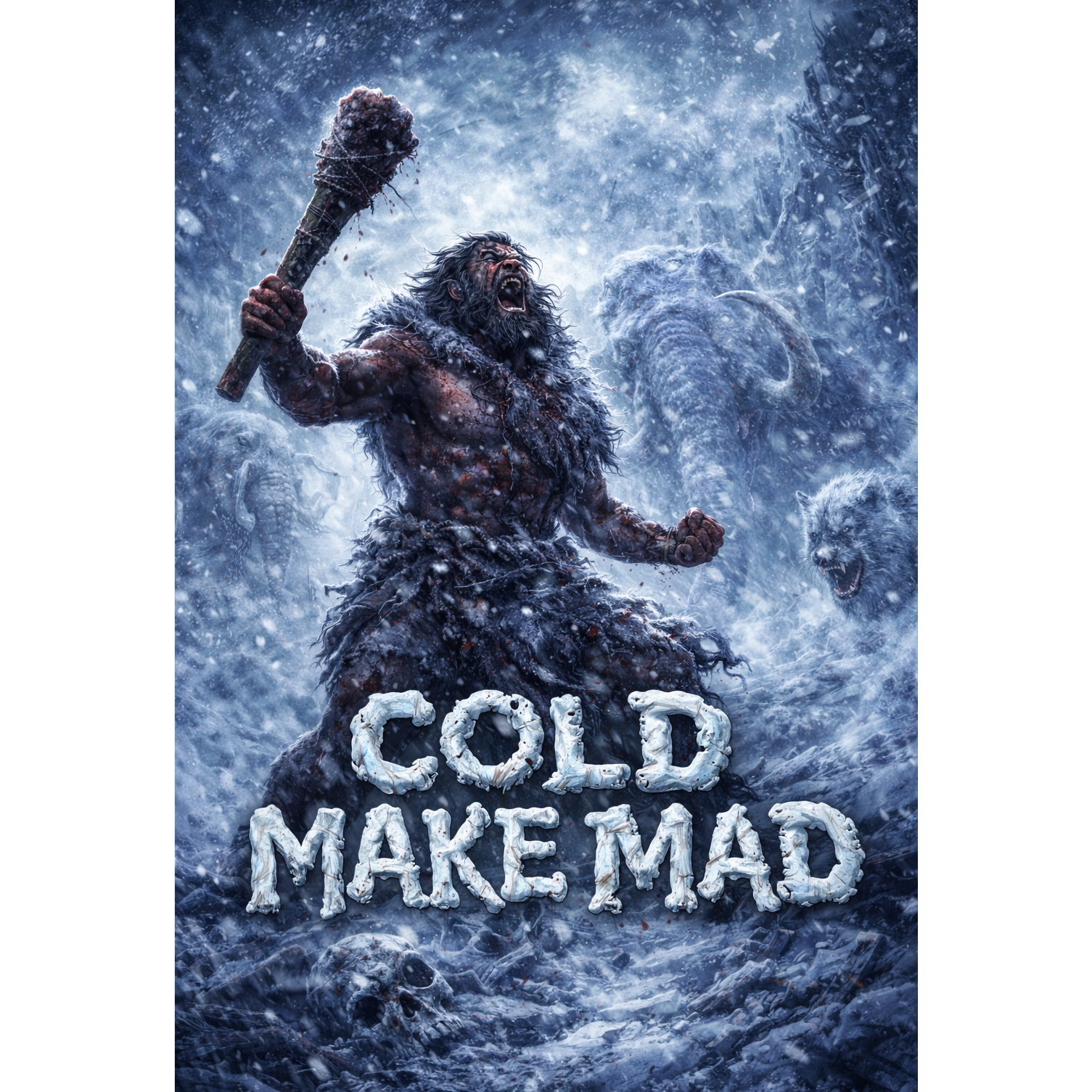 Ultra primitive caveman slam death metal, Ice Age theme, drop E / drop D# tuning, caveman one-string riffs, ugly raw mix, no clean vocals, deep gutturals + caveman shouts, relentless blast beats into stupid halftime slams, big sub drops, bone percussion, wind/blizzard ambience, short violent 2:40–3:10, minimal melody, maximum impact