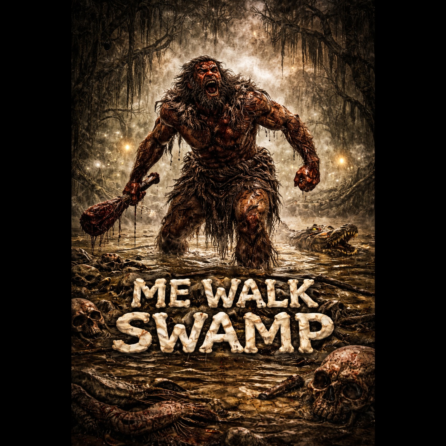 Slam death metal fused with doom metal, ultra heavy caveman riffs, drop A# / drop G, filthy downtuned guitars, thick crawling doom sections, sudden brutal slam drops, no clean vocals, deep gutturals + caveman shouts, occasional pig squeal, slow oppressive tempo changes, swamp ambience (insects, bubbles, distant croaks), raw ugly mix, massive low end, 3:30–4:20 total length, minimal melody, maximum weight