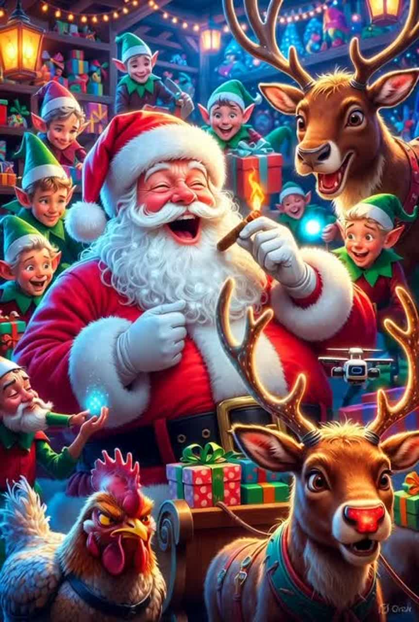 [Upbeat swinging Christmas big-band, 122 BPM], [deep, slightly raspy male crooner, warm velvet stem met karakter – geen gladde standaardstem, geen kinderkoor, geen achtergrondzangers], [vette brass, smoky upright bass, brushed drums, smaakvolle sleigh bells op de off-beat], [ho ho ho & hahaha als swingend achtergrond-instrument], [grappig, cool, volwassen humor, zero emotionele cheese], [crisp live-lounge productie, warme reverb], [filter all noise, crystal clean], [full 3-4 minute track met dikke brass finale]