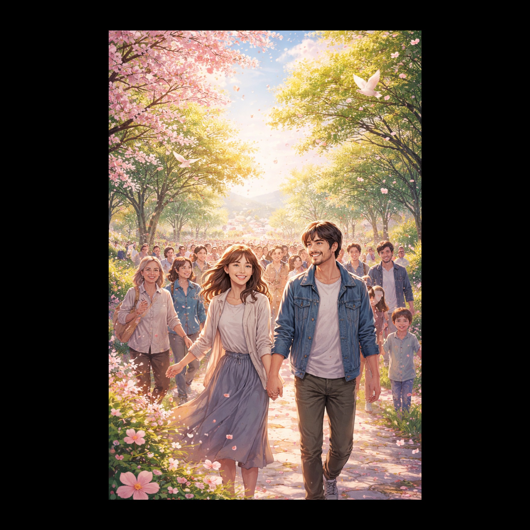 Cinematic pop × ambient electronica, 100 BPM, C major, Felt-piano, warm strings, airy pads, soft kick + brushed snare + handclaps on 2&4 (low in mix), subtle crowd “oh”s, Female vocal: clear/warm; chorus doubled + gang-vox ad-libs (“together!”), Simple, memorable hook, Plate reverb lush, gentle tape glue, quarter-note delay throws at end of chorus lines, Keep dynamics, no heavy EDM risers