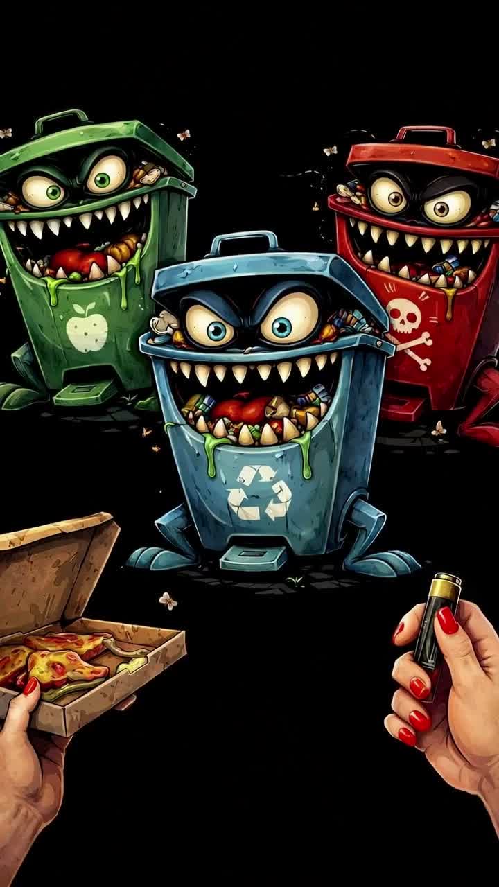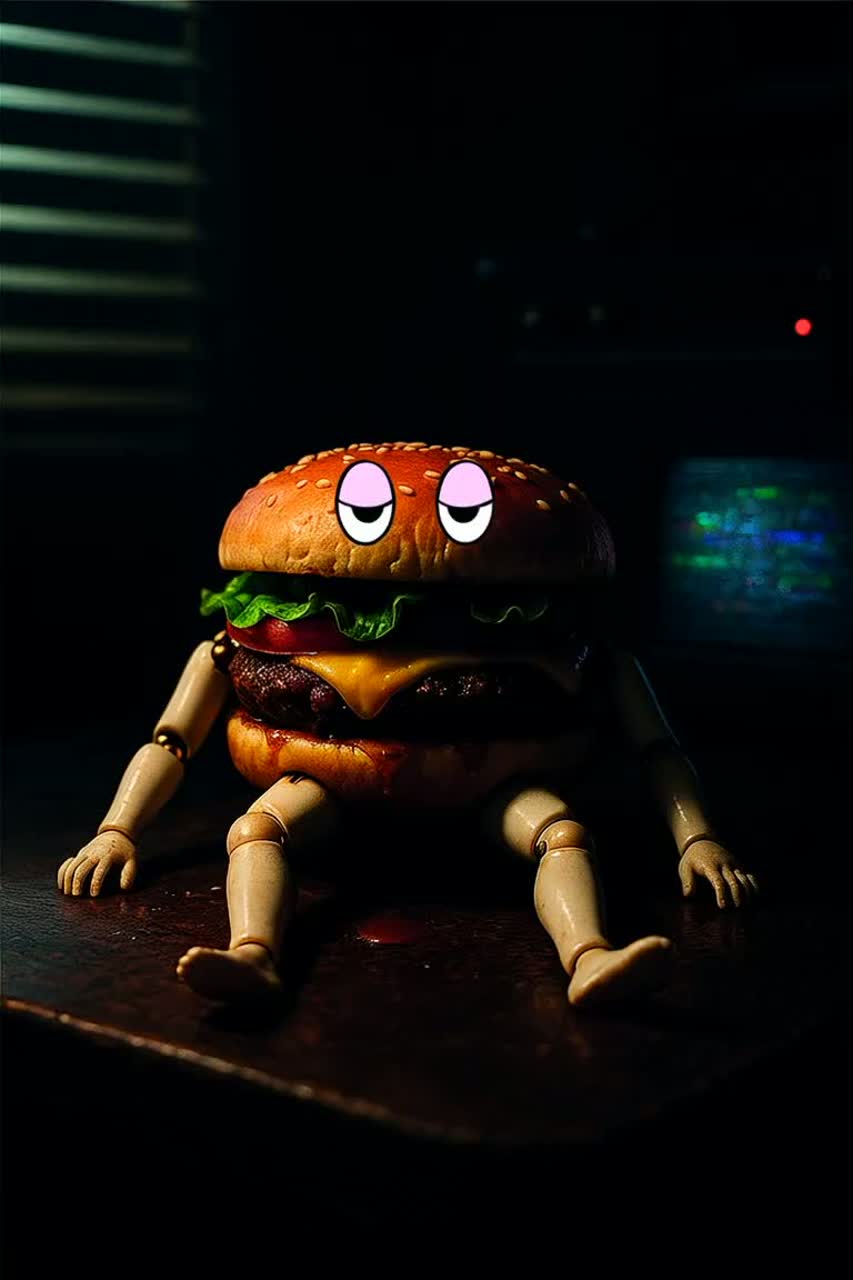 [FUSION: 1960s Spy-Noir (muted tremolo guitar, spring reverb, brushed drums) × Lo-Fi Cartoon Sound Design (bouncy organ, comic perc, 8-bit glitch, grease/chewing) × Techno-Horror (bass drops, monster footsteps, concrete crush, distorted laughter)] SPOOKY