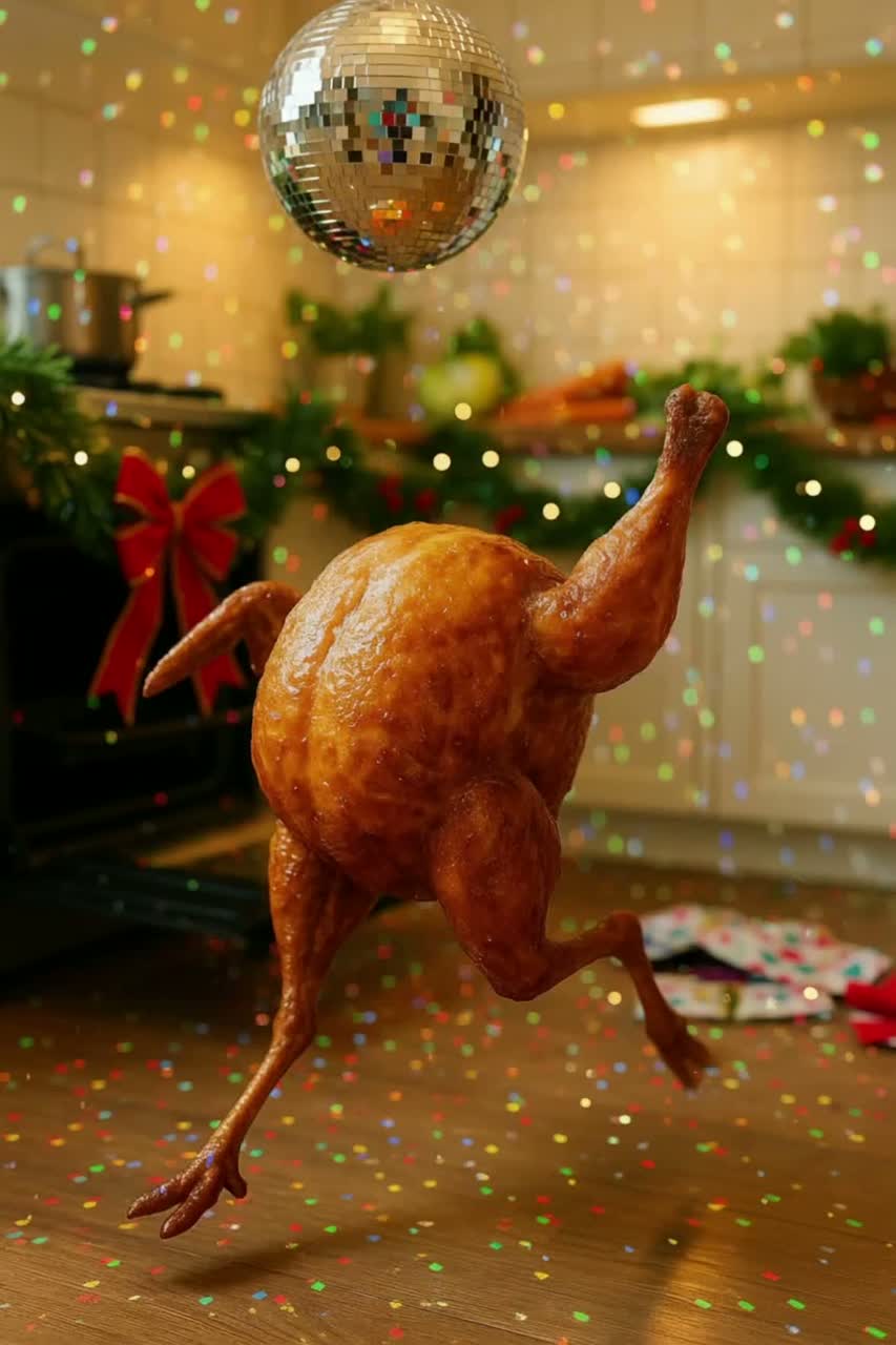 “Ultra-funky 1970s sing-along disco-soul groove with a tight live band and a humouristic, theatrical vibe, Punchy four-on-the-floor drums with crisp hi-hats, funky ghost-note snare, fat slap bass, and wah-wah rhythm guitar in constant syncopation, Bright horn section (trumpet, sax, trombone) delivering bold stabs and call-and-response riffs, Smooth Rhodes and shimmering disco strings in the chorus, Lead vocal: a powerful Black American gospel diva with a huge, resonant chest voice, deep and commanding low notes, gritty soulful belts, big vibrato, and explosive ad-libs; rich gospel tone with attitude and humor, Backing vocals: stacked Motown-style harmonies responding to the lead, Overall vibe: a 70s comedy chase-scene on a dancefloor — fun, cheeky, high-energy, theatrical, perfect for a runaway turkey story, ”