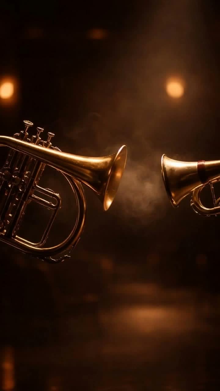 Instrumental cinematic brass composition, no vocals, emotional and intimate, 72 BPM half-time feel, minor key, two distinct trumpet voices performing a call-and-response duet like human lovers, one warm and breathy (flugelhorn style), one brighter and fragile (muted trumpet), expressive phrasing with slight pitch drift and breath noise, slow swelling brass choir, deep tuba sub-support, subtle french horn bed, minimal cinematic percussion, soft timpani pulses, distant low drums, long reverbs, wide stereo field, human timing imperfections, emotional tension and release, slow build into a powerful but tender climax, intimate film-score energy, modern cinematic mix, no synth leads, brass carries melody and emotion