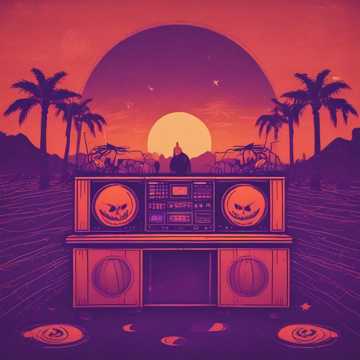 90s techno party, halloween, dance, synth-driven, powerful and eerie; layers of pulsing synths and driving basslines create a spooky yet triumphant vibe, fast-paced beats keep the energy high
