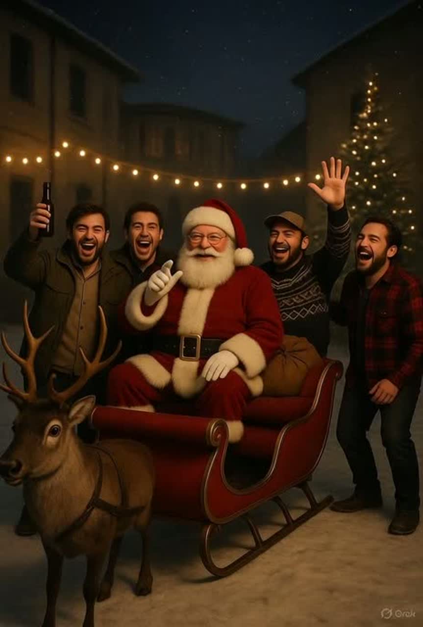 A vibrant Christmas pop-swing anthem starts with sleigh bells, brass stabs, bold orchestral hits, and swinging piano, jumping into an upbeat, bouncy groove with walking bass, finger snaps, and hand claps, Playful stop-and-go keeps energy high, Verses bounce with syncopated rhythm; pre-choruses climb with swelling chords, punchy choir “oohs, ” and bold brass lifts, Choruses explode: catchy hooks, chantable “oh oh oh”, “la la la”, tons of call-responses, crowd-clap breaks, and joyful horn riffs, Classic big band swing merges with tight, glossy pop production, playful and joyous, Expressive charismatic lead, lively real choir and backing vocals add warmth without overpowering, Everything bursts with irony, affection, and party spirit—deliberate holiday chaos, ready for merry dancing