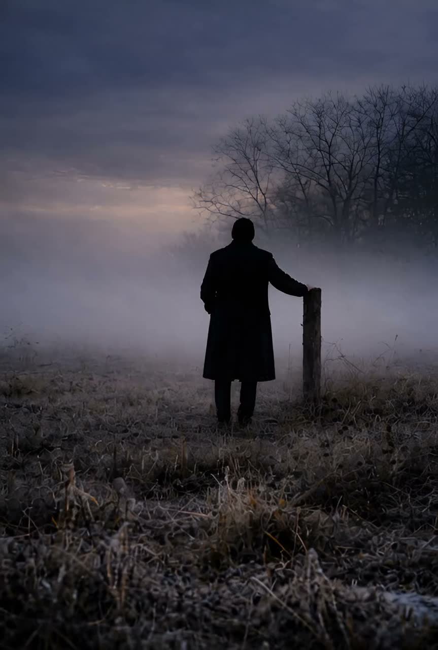 Dark Gothic Folk, Soft Appalachian, Fingerpicked Acoustic Guitar, Open DADGAD Tuning, Droning String Resonance, Bowed Cello Sustained Texture, Sparse Upright Bass, Low Baritone Male Vocals, Near-Spoken Delivery, Conversational Phrasing, Audible Breath, Raw Unpolished Vocal, Dry Close-mic'd voice, Analog Warmth, Slow Andante, Desolate Late-Autumn Mood, Intimate Sparse Arrangement
