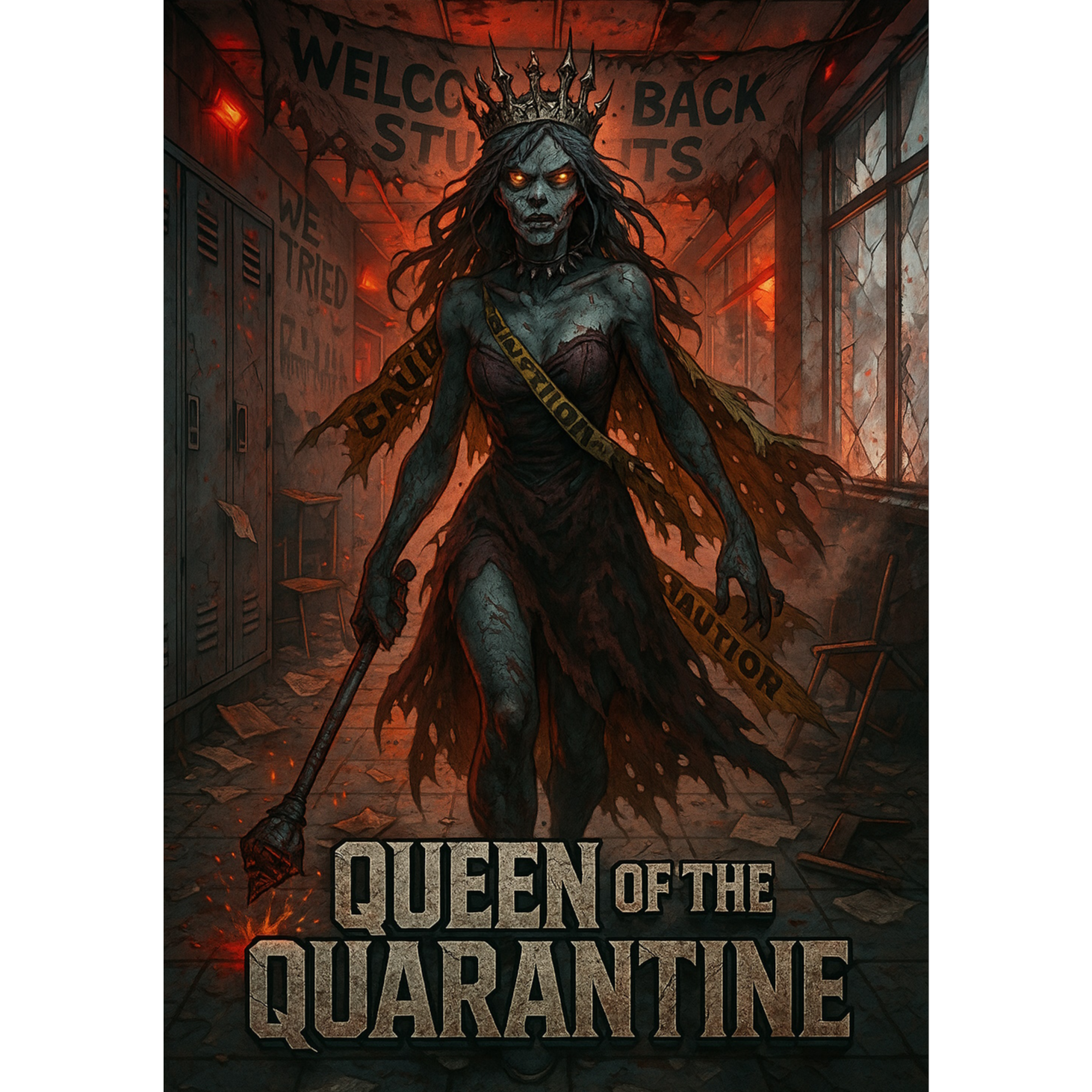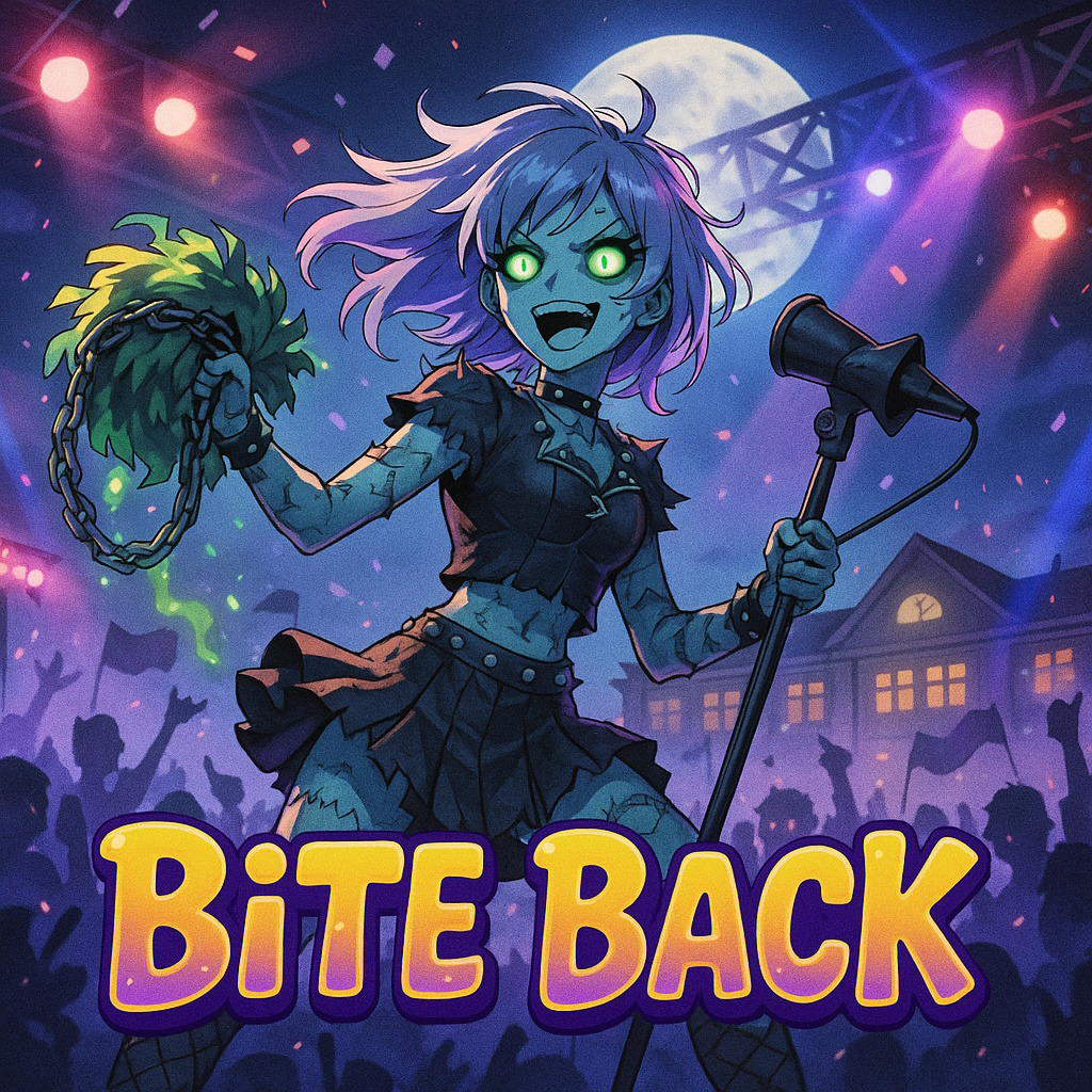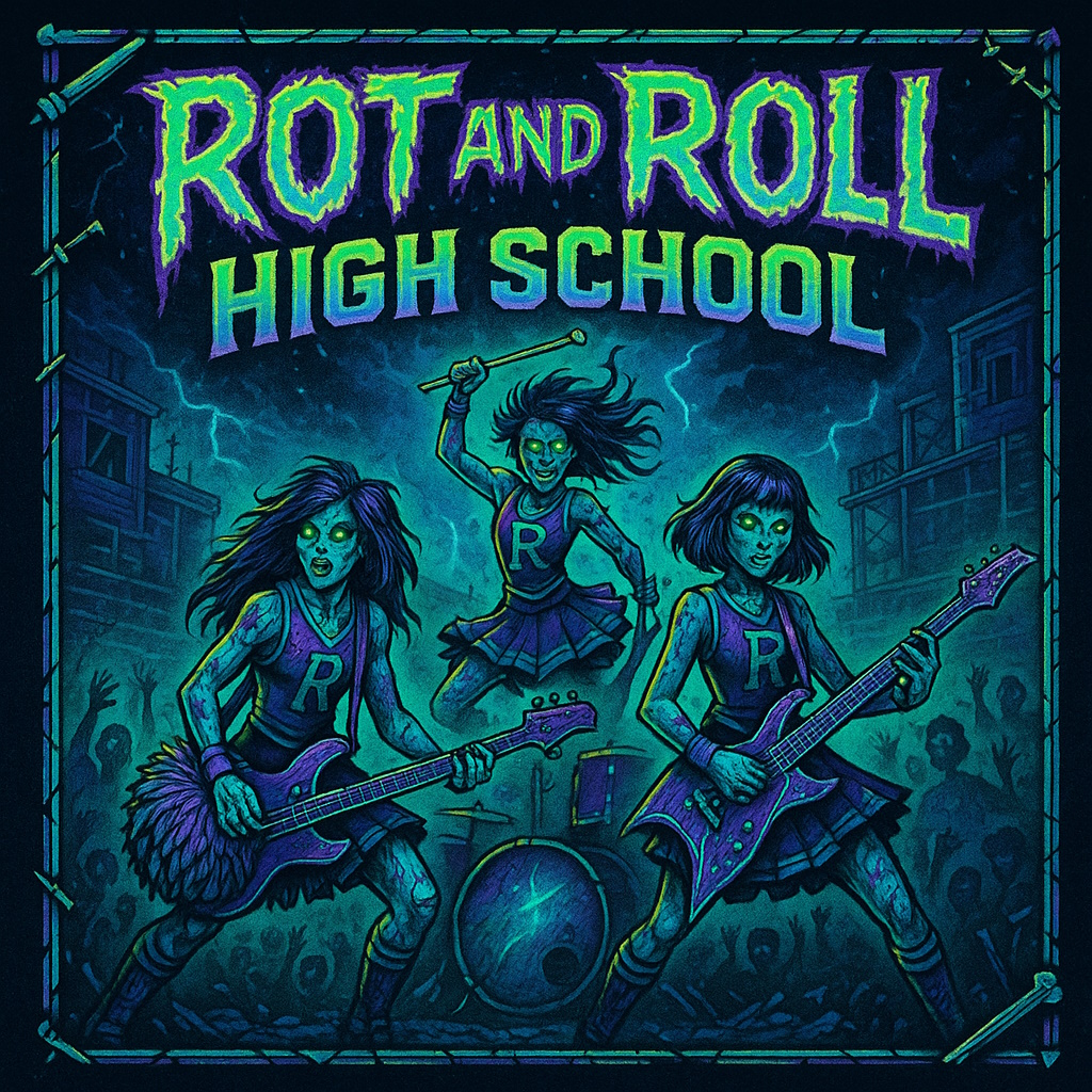 Create a high-energy rock and roll anthem with a rebellious teen vibe, Female lead vocals with attitude, blending pop-punk clarity and sass with a gritty rock edge, The instrumentation should feature distorted electric guitars, punchy basslines, pounding arena-style drums, and dynamic build-ups, Include moments of gang vocals or chant-style hooks in the bridge, The chorus should be big and bold — designed for fist-pumping, stage-stomping impact, Keep the mix crisp and vibrant, with teen-pop-inflected melodies over gritty rock instrumentation, Think horror high school vibes with a zombie twist — playful, fierce, and undead