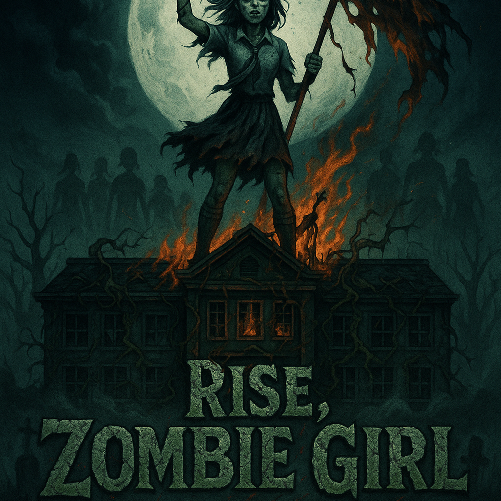 Rock and roll anthem with moderate tempo and emotionally grounded female vocals, Electric guitar leads with a gritty, steady rhythm, supported by haunting backing melodies and echo-heavy drums, Vocals should feel raw but calm — confident and defiant without shouting, Include subtle horror-inspired instrumental layers like creaky background ambience or reverb-drenched whispers during the bridge, Lyrics tell the story of a zombie girl rising from the grave to defend her school from evil forces, standing tall with loyalty and undead pride, The mood is gritty, determined, and empowering, with a cinematic edge to the chorus and a spoken intro and whispered outro, Keep the tone heroic and slightly eerie without being aggressive or fast-paced