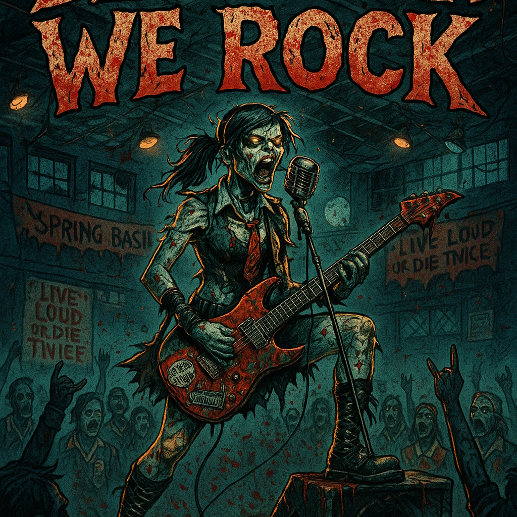 A fast-paced, high-octane rock and roll anthem with powerful female vocals leading the charge, The track roars with gritty electric guitar riffs, pounding drums, and an explosive chorus that channels post-apocalyptic energy, The vocals are fierce, aggressive, and unapologetically raw — channeling the spirit of a zombie girl marching through a ruined world with her guitar as her weapon, Themes of undead rebellion, rock as resistance, and survival through sound, The chorus explodes with lines like “Dead walk, we rock — apocalypse got nothing on us!” and “Raise your horns, raise your fists — we rise with the undead!” Sound design blends classic hard rock with punk attitude and cinematic breakdowns for intensity, Think stadium-sized destruction with a fiery female voice rising from the ashes