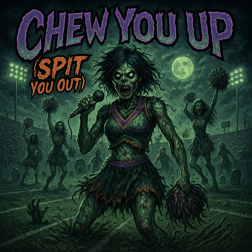 High-energy rock and roll track with punk cheerleader attitude, blending crunchy distorted guitars, stomping drums, and crowd-style cheer claps, The music should drive with a raw, fast tempo, mixing sassy rock riffs with halftime breakdowns for chant sections, Add a wild guitar solo mid-song for intensity, Female vocals: fierce snarling soprano with playful growls, rebellious cheerleader chants, raw belted choruses, and layered gang shouts for the breakdown, Vocal delivery is sarcastic, hungry, and revenge-driven, shifting between sharp, melodic hooks and raw screams, Overall mood: zombie cheerleader horror revenge — fun, chaotic, and dangerous, like a halftime show from the grave