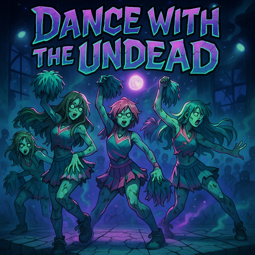 A high-energy fusion of rock and roll and dance music, built around pounding live drums, distorted electric guitars with sharp riffs, grooving bass lines, and pulsing electronic synth layers, The track should drive with a steady rock rhythm that blends seamlessly into a dance-floor beat, combining live rock instrumentation with club-style drops and buildups, Female vocals only, featuring multiple distinct voices: a fierce lead vocal with a gritty rock edge, layered harmonies that add attitude and power, and group chants in the chorus to mimic a zombie cheer squad, Vocal styles should switch between commanding lead delivery, playful and sassy backing lines, and unison group shouts for an anthemic feel, Mood is wild, rebellious, and theatrical — a midnight graveyard dance ritual that feels both infectious and dangerous, with a breakdown in the bridge that lets the chants dominate before exploding back into a heavy guitar-and-synth final chorus