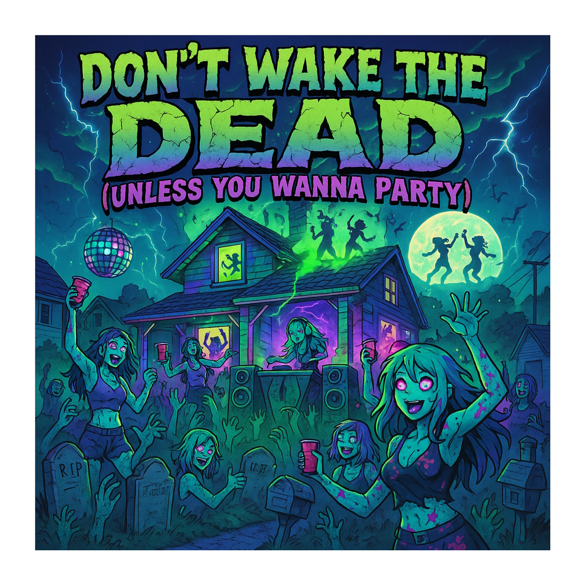 High-energy zombie rock and roll anthem (140 BPM, 4/4 time) with female lead vocals and gang-style background shouts, Start with heavy crowd stomps and claps, then break into distorted electric guitars, gritty bassline, and thunderous live drums, The vibe is undead riot meets graveyard rave — think zombie girls tearing up a graveyard stage while lightning flashes over tombstones, The chorus should hit with shouted gang harmonies echoing “Don’t wake the dead—UNLESS YOU WANNA PARTY!” and layered crowd energy throughout, Add reverb-soaked vocals, feedback guitar screeches, and bursts of organ or theremin for eerie flair, Tone is wild, chaotic, and infectious — a full-blast zombie celebration where decay meets rock glory, Female Vocal Tag: gritty punk-rock mezzo-soprano with undead swagger and raspy attitude