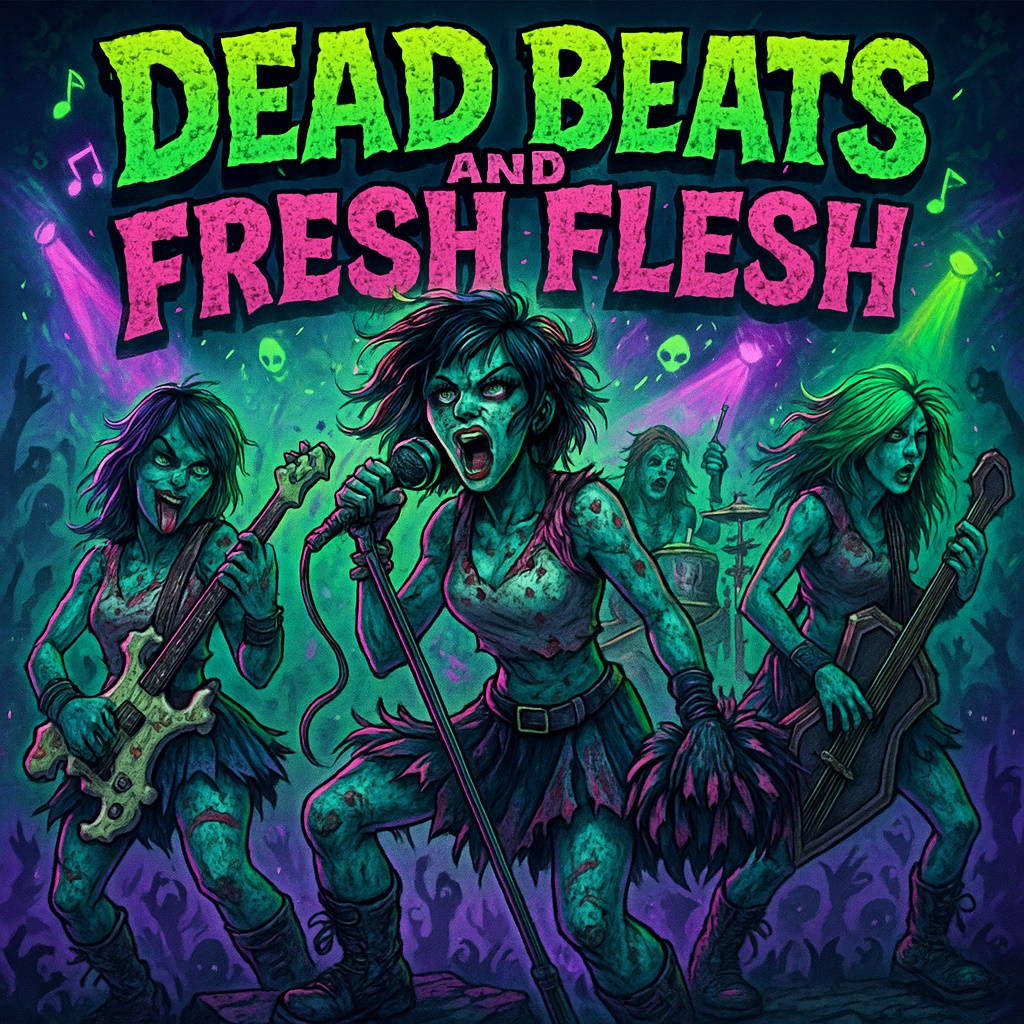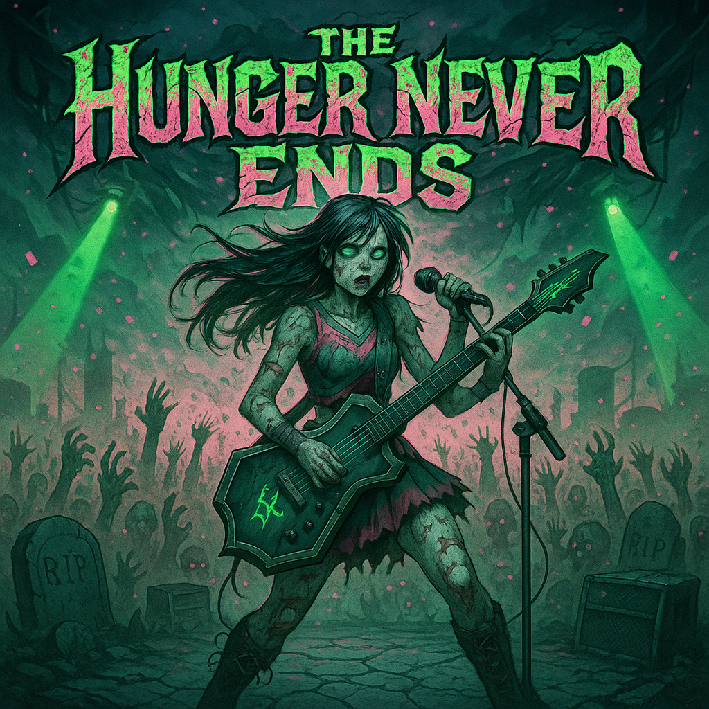 A hard-hitting rock and roll anthem with a fierce blend of alternative and arena rock energy, featuring bold, gritty female vocals, The track captures the relentless drive of a female zombie who’s back from the grave and starving for more — not just flesh, but the thrill of chaos, Fast-paced guitar riffs, thunderous drums, and stadium-style gang vocals fuel the song with undead swagger, The chorus hits big with chantable hooks, power chords, and fiery vocal delivery, Verses are energetic and punchy, with a rebellious tone, while breakdowns feature distorted guitars and crowd-stomping rhythms, No slow sections — this is pure undead rock fury with pink-and-green attitude and zombie-fueled adrenaline