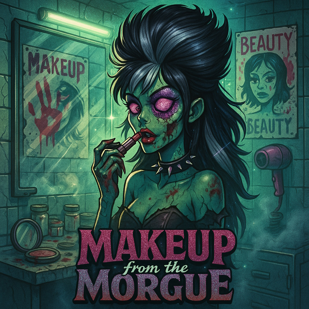Hard rock / alternative rock zombie girl anthem at 160 BPM, Distorted electric guitars, pounding drums, gritty bass, with glam horror energy, Female vocals: raspy mezzo-soprano with eerie vibrato and fierce snarl — sounds like a zombie rising from the grave to slay the stage, Vocal tag: “undead glam queen with a bite, ” Mix of snarled, melodic lines and haunting spoken phrases, Horror-glam lyrics about using grave dirt as blush, blood for lipstick, and turning death into runway fashion, Think glam rock meets gothic decay with attitude, Mood is fierce, stylish, creepy, and confident, Echo effects on backing vocals, Dark fashion horror vibes with stomping beats and corpse couture swagger