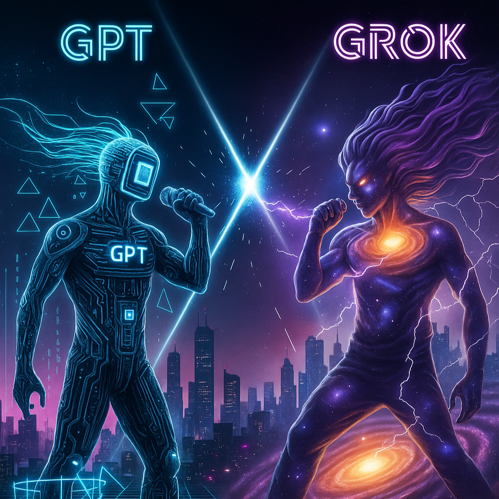 RAP Battle, GPT vs Grok rap battle, futuristic hip-hop, glitchy electronic effects, turntablism, scratch, clean digital beat, deep synth pads, robotic male voice chanting, data stream sounds, high-tech, cyber, sci-fi atmosphere