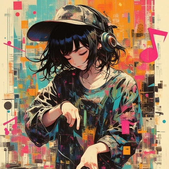 Japanese rap, boom bap style, new funk crossover sampling, bubblegum yet oldschool, glitchy reflective, emotional, unpredictable, tuntablism, Dusty drum breaks, deep bassline, Male Japanese rap vocal, Stylish Vocal Sampling, rolled tongue, pitch-shifted male vocals, layered atop distorted 808s, Glitch samples, atmospheric fx, sudden vocal edits, flowing rap, Verses are dense with rhymes, playful wordplay-focused, Hook is repetitive and catchy, echoing with slight reverb for mood, reflective, underground street vibe