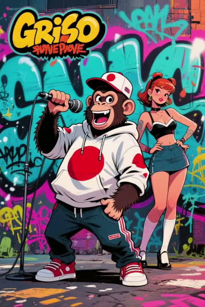 Upbeat Japanese hip-hop with funky old-school vibe, inspired by early 2000s J-rap, 2MC, diggy, rolled tongue, infectious danceable beats, groovy basslines, and playful MC energy, Features tight snares, funky hi-hats, and driving kick drum, Male vocal ensemble with dynamic rap flows, layered harmonies, and call-and-response hooks