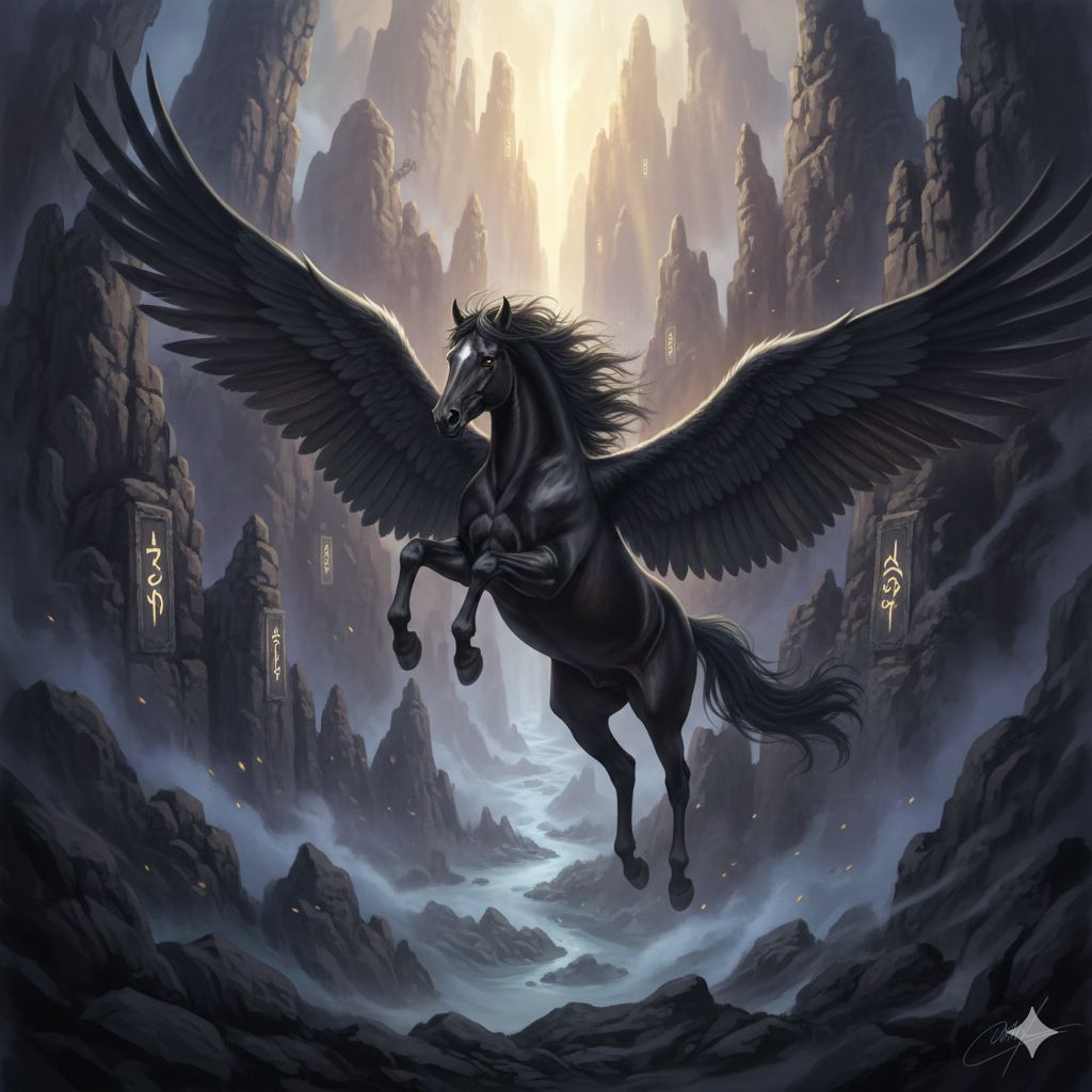 (Fast percussion, galloping rhythm of Pegasus wings)