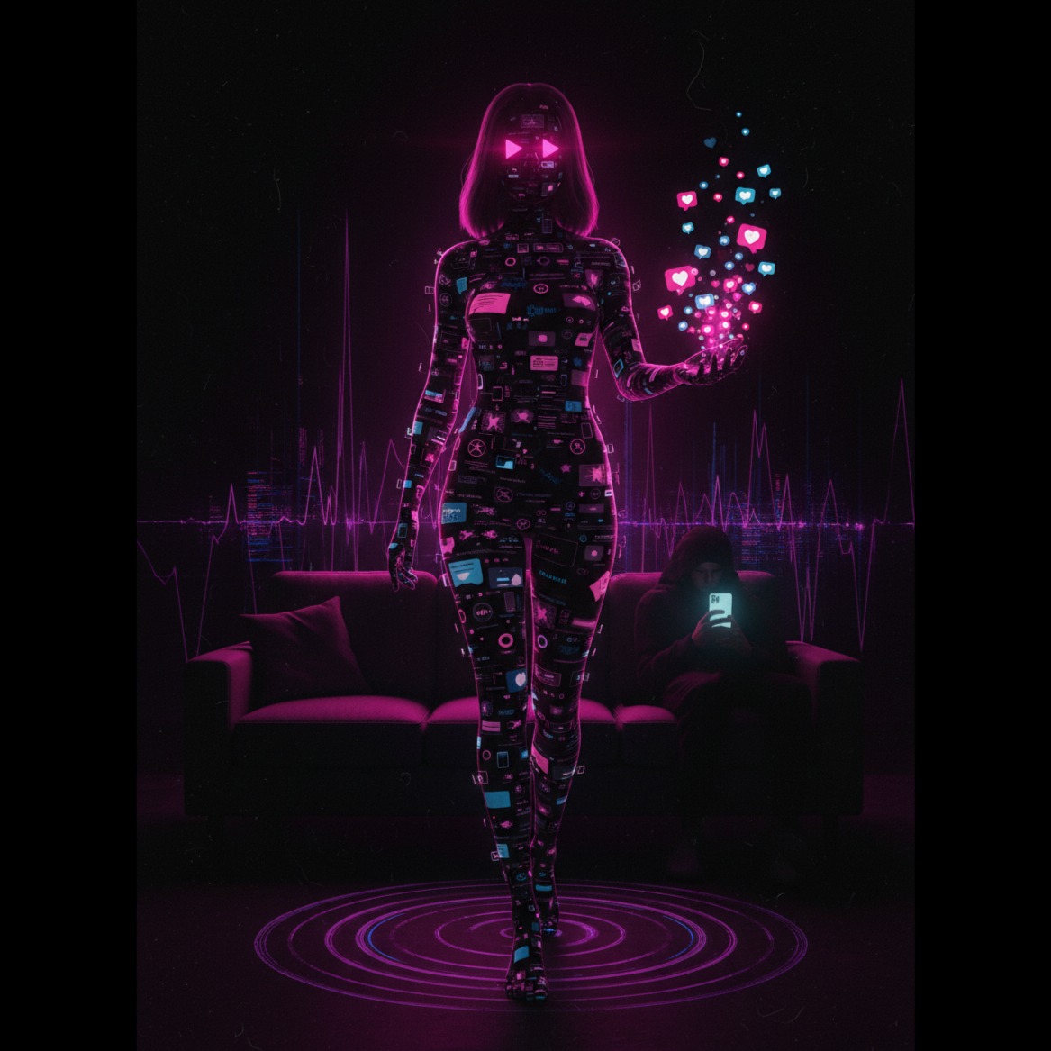 A female vocalist sings over a heavy Funk Metal piece, It features 105 BPM with a seductive, swaggering groove concealing underlying menace, set in Minor key, Drop D tuning, Slap bass drives a percussive popping funk bassline with sub-bass drops, Distorted guitar plays heavy palm-muted riffs with funk-syncopated staccato patterns and power chord accents, Drums blend funk groove with ghost notes, syncopated hi-hats and rim clicks alongside metal double-kick fills and crashes, Vinyl scratches punctuate between riffs adding hip-hop grit, Notification sounds and glitch artifacts pepper the mix, Vocals shift between playful confident swagger in verses and powerful commanding hooks with layered harmonies in choruses, dropping to intimate whisper in the bridge, Production is punchy and groove-driven, slap bass and kick locked tight, thick crunchy guitars wide, vinyl scratches for texture, sidechain compression pumps subtly, Mix grows progressively more digitally processed through the song