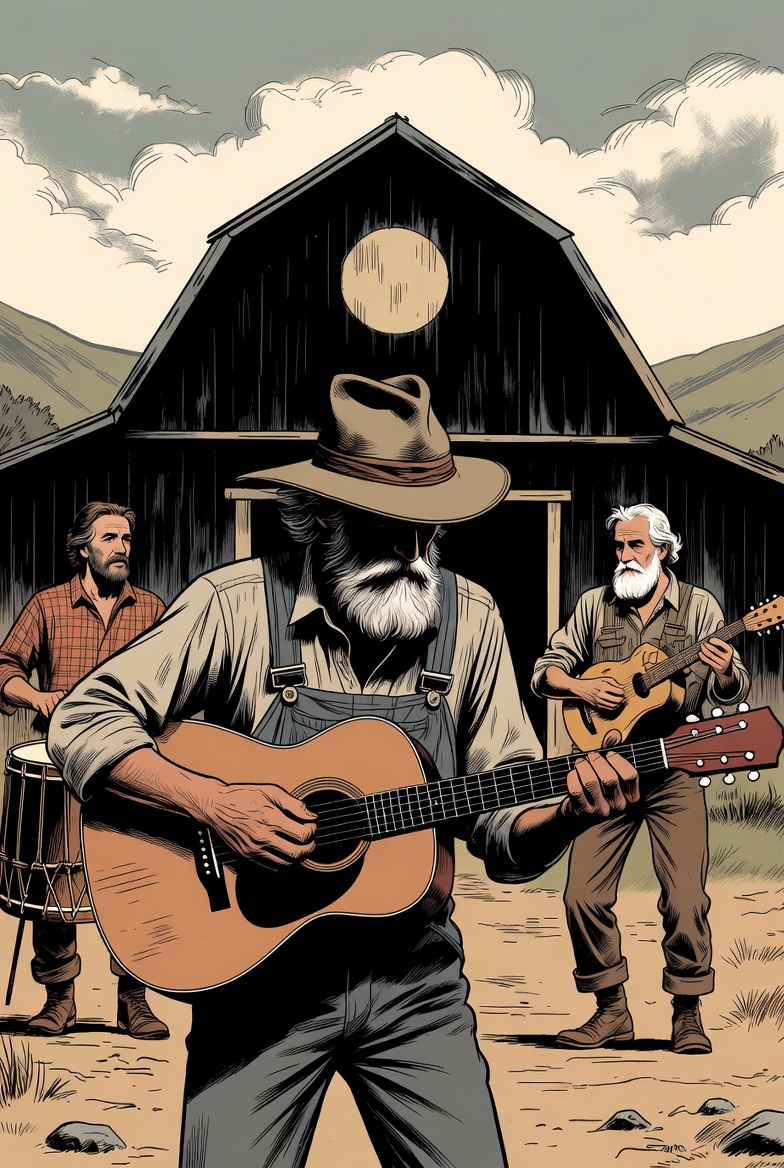 This techno track features only acoustic Western instruments—upright bass lays a pulsing groove, twangy slide guitars and hand percussion deliver syncopated breakbeats, while nimble banjo plucks echo in the mix, Deep dubstep pulses blend with a sampled Amen Break, all under a hi-fi sheen, and a distant, growling vocal texture permeates the atmosphere