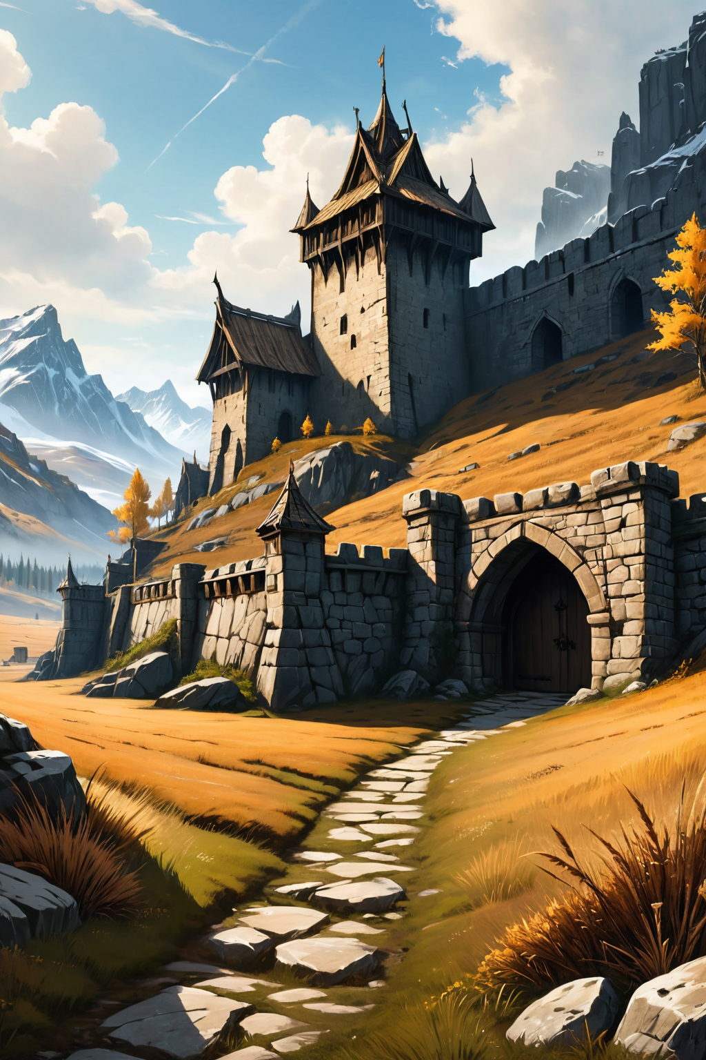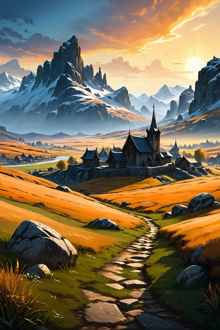 Ambient medieval western RPG soundtrack, subtle and atmospheric, warm rustic wistfulness, classic medieval ambience, ancient acoustic storytelling, wide cinematic folk sense, evolving folk harmonies, ancient folk flavor, smooth evolving acoustic textures, slow wandering traveler mood