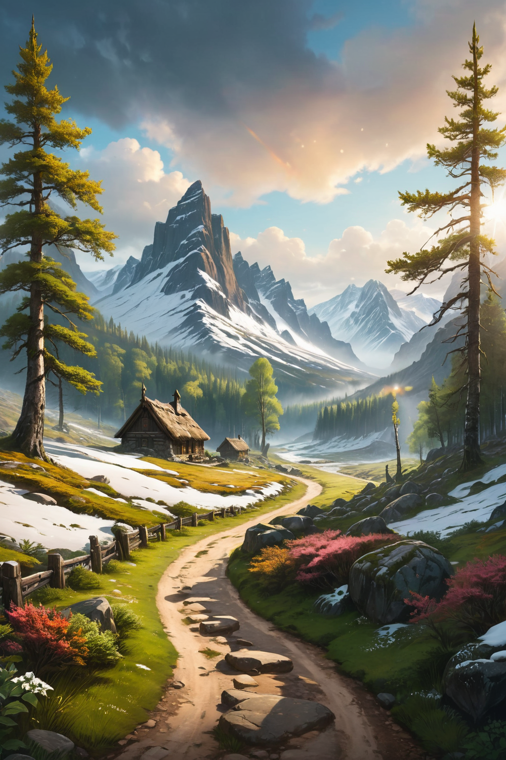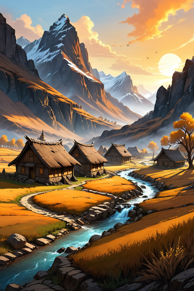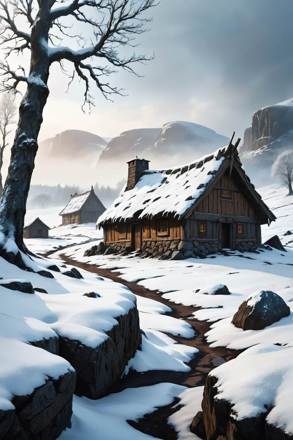 Ambient medieval western RPG soundtrack, subtle and atmospheric, smooth evolving acoustic textures, minimal uncluttered arrangement, light rune-inspired harmonic shimmer, gentle flowing lute rhythm, light snow crunch underfoot texture, fluid transitions between motifs, breath-like flute phrasing rhythm, twilight village lullaby, warm natural resonance, melody unfolding gradually, minimal expressive movement, soft horn fanfare motif, quietly steady village-tempo pulse, quiet nordic flute calls, fading atmospheric ending, ancient acoustic storytelling