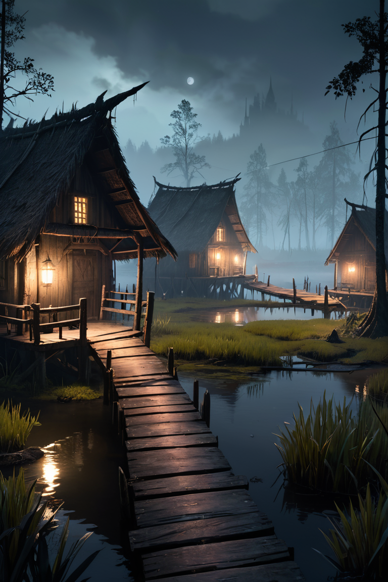 Ambient medieval western RPG soundtrack, subtle and atmospheric, Use only a few instruments: bowed lyre and low wooden flute, with optional very soft frame-drum pulses spaced far apart, Simple, sparse melodic motifs in Dorian mode, drifting slowly, Very slow, steady rhythms, Cool, murky, and slightly tense texture, like faint music carried over misty wetlands at night, Atmosphere dark, quiet, and uneasy, evoking a cold night in the marshes around Morthal, Firelight flickers through fog, distant frogs and insects echo softly, and the sense of hidden shapes moving in the reeds lingers on the edge of awareness, **